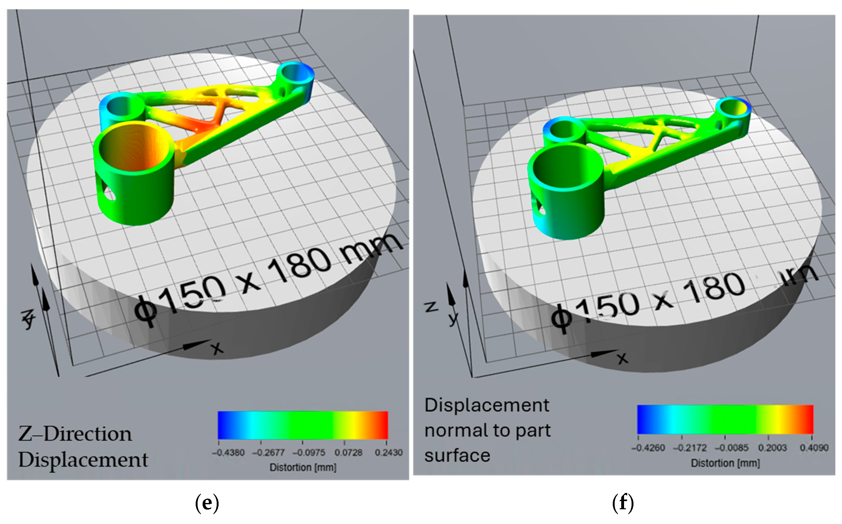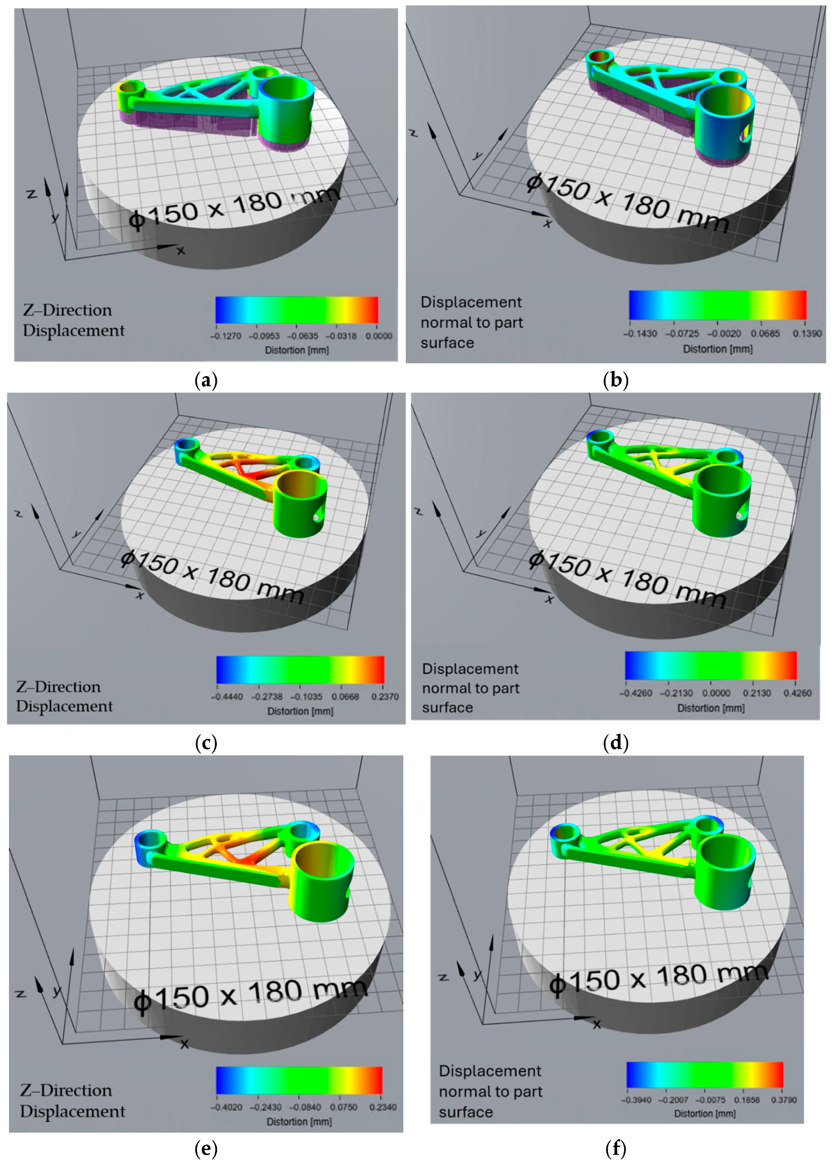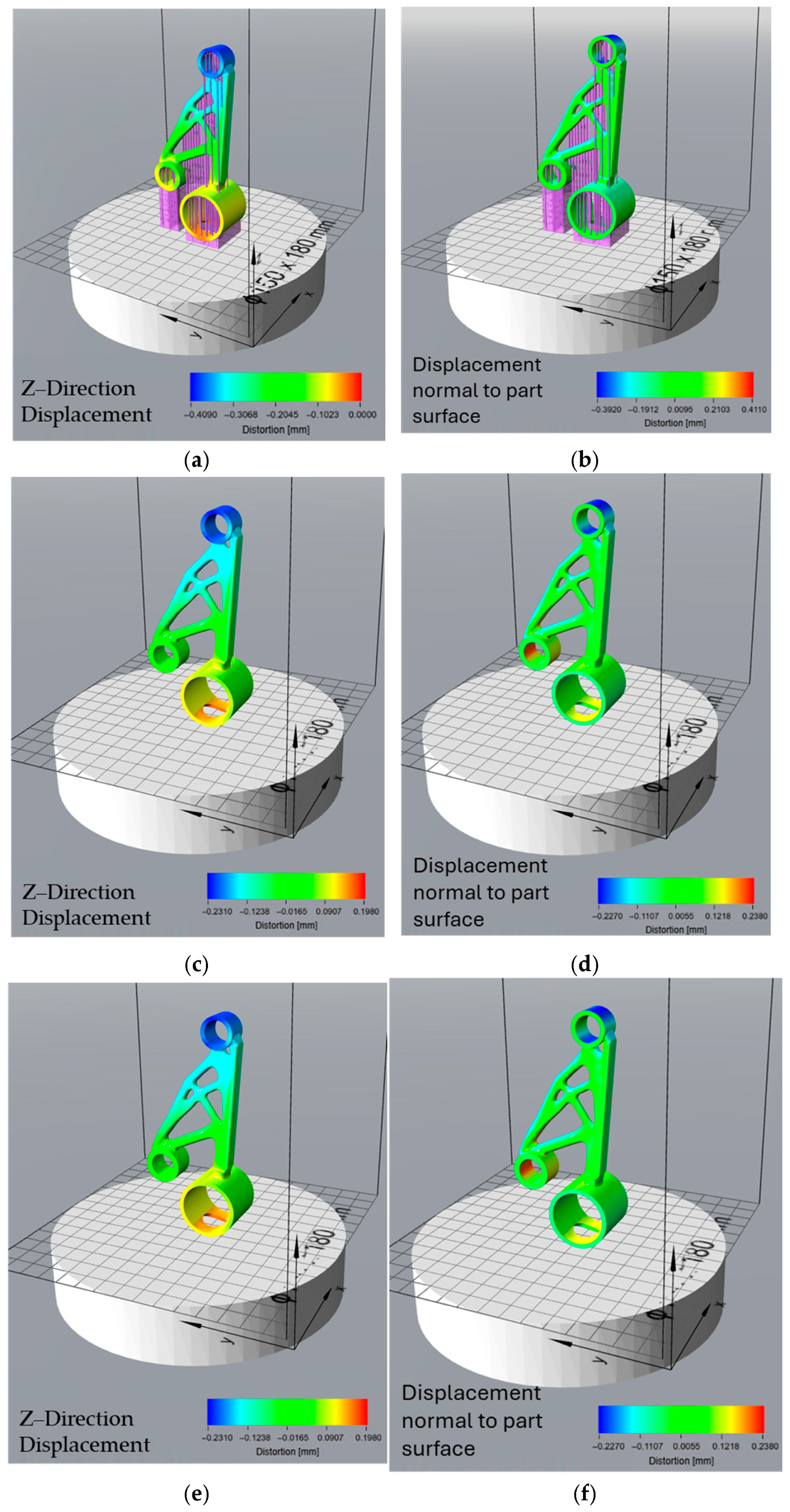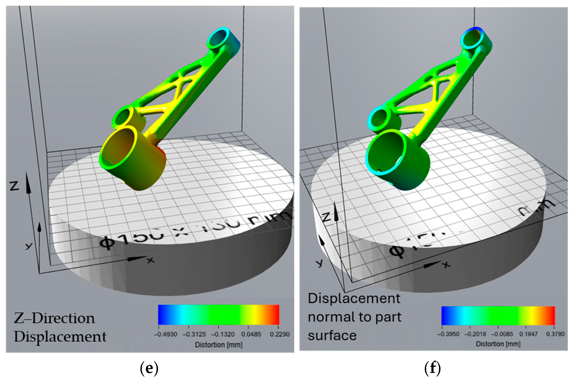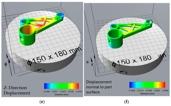Figure 11f) offers an even more accurate and practical view of final part quality. This prediction also uses normal surface deviation, making it suitable for full 3D shape comparison. It is the most realistic measure of real-world geometric error, accounting for both build-stage distortion and stress relief effects after support removal. This type of analysis is especially useful for quality control, as it reflects the final geometry delivered to the end user. The close match between Atlas 3D’s prediction and the scan after post-processing suggests that the simulation tool is reliable for predicting final part shape, particularly when used in combination with a 3D scanning workflow. This kind of comparison can also support more informed post-processing decisions, such as the need for machining or rework on specific features. These findings are consistent with those of Giubilini et al., who validated the predictive accuracy of Amphyon simulations by demonstrating good agreement with 3D scan results and emphasized the potential of virtual pre-compensation in improving shape fidelity [