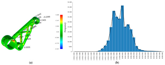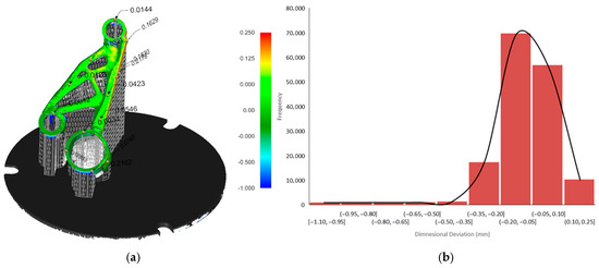 Figure 12b) supports these findings by showing that most of the part’s surface points fall within a deviation range of −0.2 mm to +0.1 mm, meaning the majority of the part is relatively close to the CAD model. However, there is a noticeable skew toward negative deviation values, with a long tail extending to −1.099 mm. This indicates that while most regions are only slightly distorted, specific unsupported or thermally stressed zones, such as thin walls or overhangs, experience significant inward warping or collapse. These extreme deviations could lead to functional problems, such as poor fit during assembly or loss of dimensional tolerance, especially for mating features. By comparison, the post-processed scan histogram (