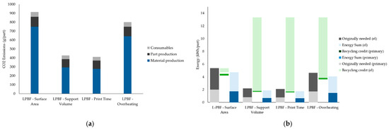 Figure 14b) reveals additional insights into the role of material recycling in AM sustainability. Across all orientations, recycling credits, especially for electricity, played a substantial role in reducing the net energy demand. However, the surface area optimization remained the least energy-efficient after accounting for recycling, due to its inherently inefficient geometry and support structure requirements. Malbašic et al. further support these findings, showing that minimizing build height and support structures through orientation optimization can effectively lower energy usage and material demand in LPBF, showing the environmental and economic advantages of early design-stage decisions.