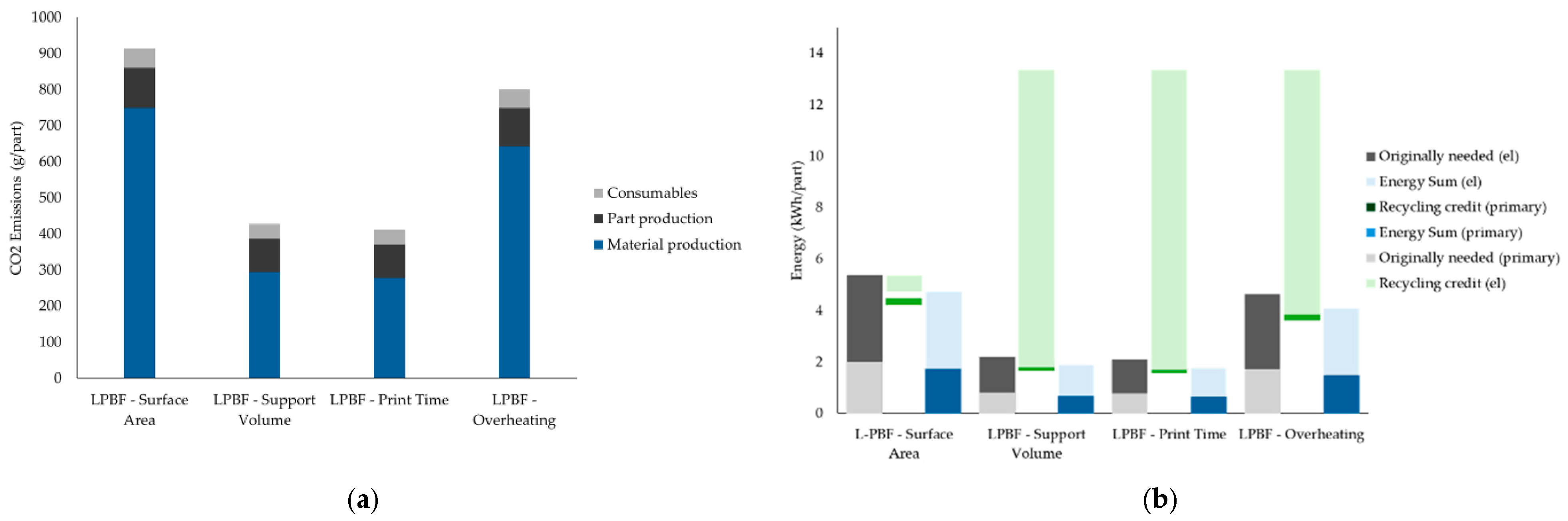 2 emissions, energy consumption, and overall cost. This outcome is primarily attributed to the large volume of material required to build extensive support structures and the increased energy demand due to longer print times and powder usage. Specifically, the material production stage alone accounted for the majority of emissions (~750 g CO
