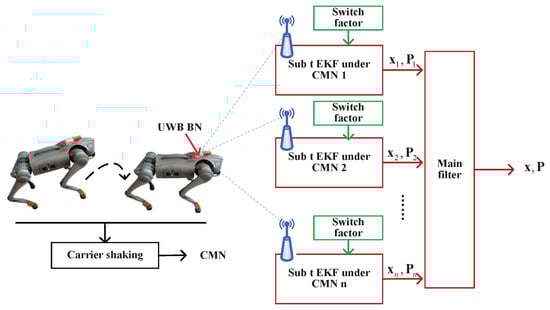 Figure 1 illustrates the UWB localization method for a robotic dog using the Student’s t-distributed EKF with switch factor under CMN. The range measurements between a BN and RNs are employed by a submodule of Student’s t-distributed EKF under CMN. The switch CMN factor, which is introduced in the following section, provides an accurate noise estimate for the filter submodules. The filter submodule returns . The main filter fuses the filter submodule outputs to provide aggregate output .