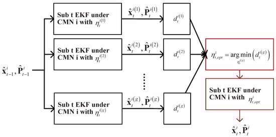 A diagram of the filter submodule considering the switch noise scheme is shown in Figure 2. For the filter submodule, we employ parameter g for the CMN factor, which is denoted as . When the filter submodule operates, the Student’s t-distributed EKF operates with and provides . We employ the Mahalanobis distance, which can be computed as follows: