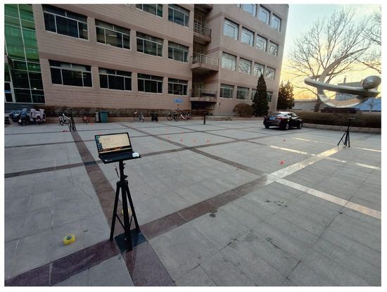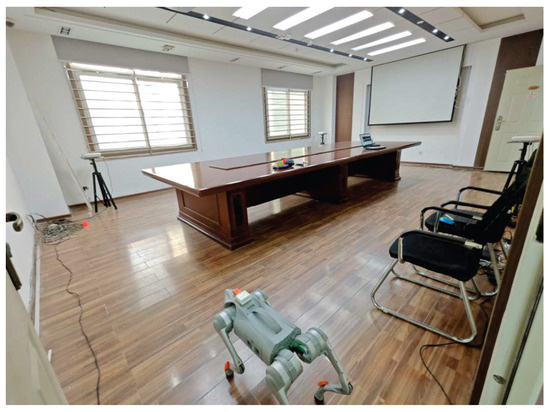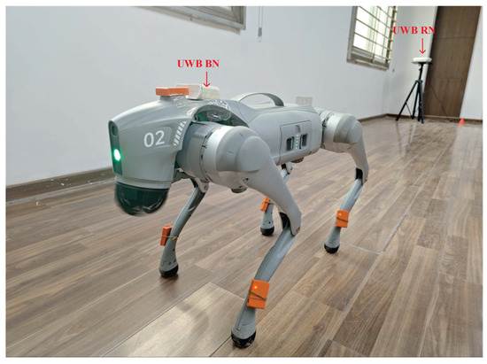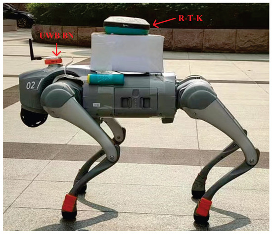 We conducted field tests in a high-level talent incubator overseas in Huaiyin District, Jinan City, China, as shown in Figure 3. Figure 4 shows the quadruped robot (robotic dog) employed in this study. In this work, robot dog GO2 from Yushu Technology was used as the platform and carrier of sensors. The experimental setup comprised eight RNs and a single mobile BN for position estimation. As shown in Figure 4, the UWB BN was fixed to the robotic dog, and eight UWB RNs were deployed at predetermined locations. Figure 5 shows the distribution of UWB RNs for testing.