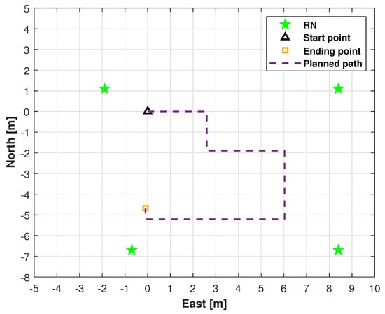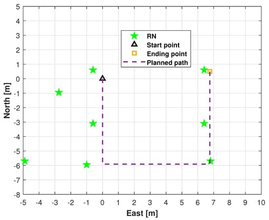 Locations of UWB RNs for testing and planned path used in outdoor test.