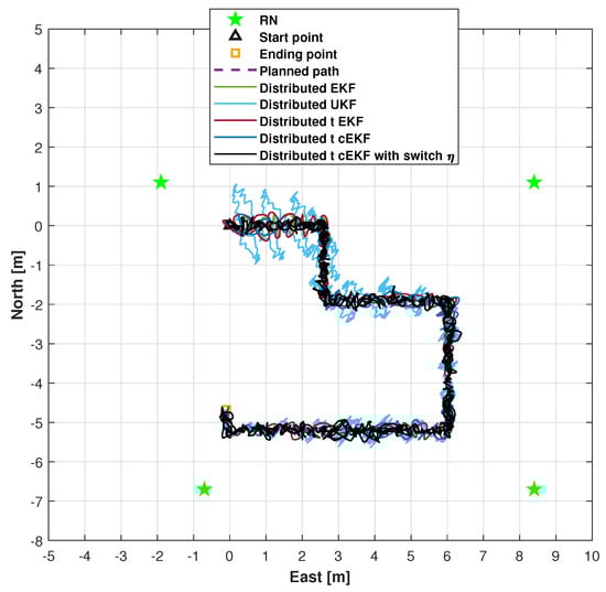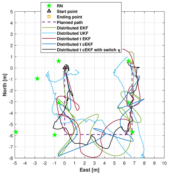 Measured trajectories along path used in outdoor test by distributed EKF, distributed UKF, distributed EKF with Student’s t-distribution, t-distributed cEKF, and proposed t-distributed cEKF with switch .