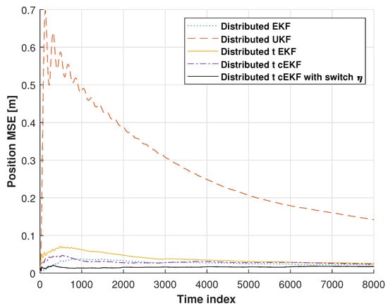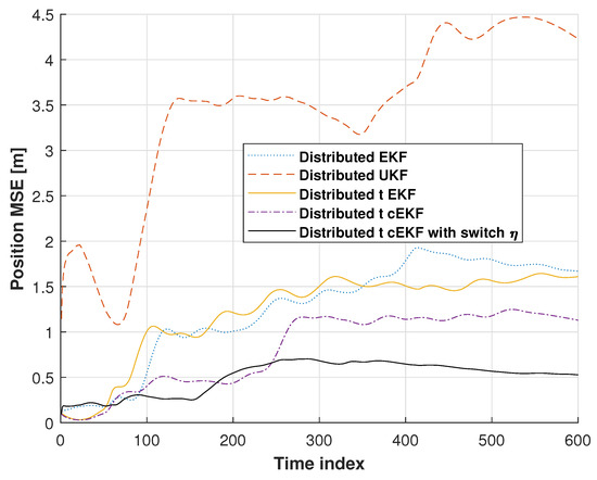Position RMSEs of distributed EKF, distributed UKF, distributed EKF with Student’s t-distribution, t-distributed cEKF, and proposed t-distributed cEKF with switch for the outdoor test.