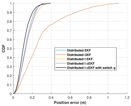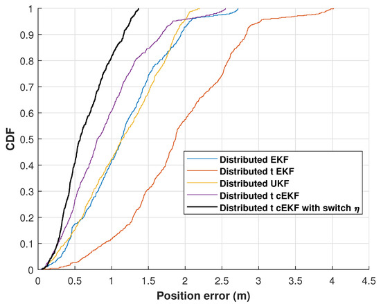 CDFs of position error obtained from distributed EKF, distributed EKF with Student’s t-distribution, t-distributed cEKF, and proposed t-distributed cEKF with switch for indoor test.