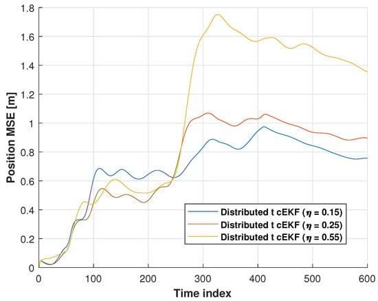 In this subsection, we will investigate the running time of the methods mentioned above. In this work, we employed Matlab 2021b to run the code, and the computer we used in this work was the Lenove X1 Carbon; its RAM is 32 GB, CPU is Intel(R) Core (TM) Ultra 7 155 H, and operates with 1.4 GHz. The running times of distributed EKF, distributed UKF, distributed EKF with Student’s t-distribution, t-distributed cEKF, and proposed t-distributed cEKF with switch are listed in Table 4. Note that the sampling time is 0.05 s in this work, and we can see that all the methods’ running times are lower than the sampling time.