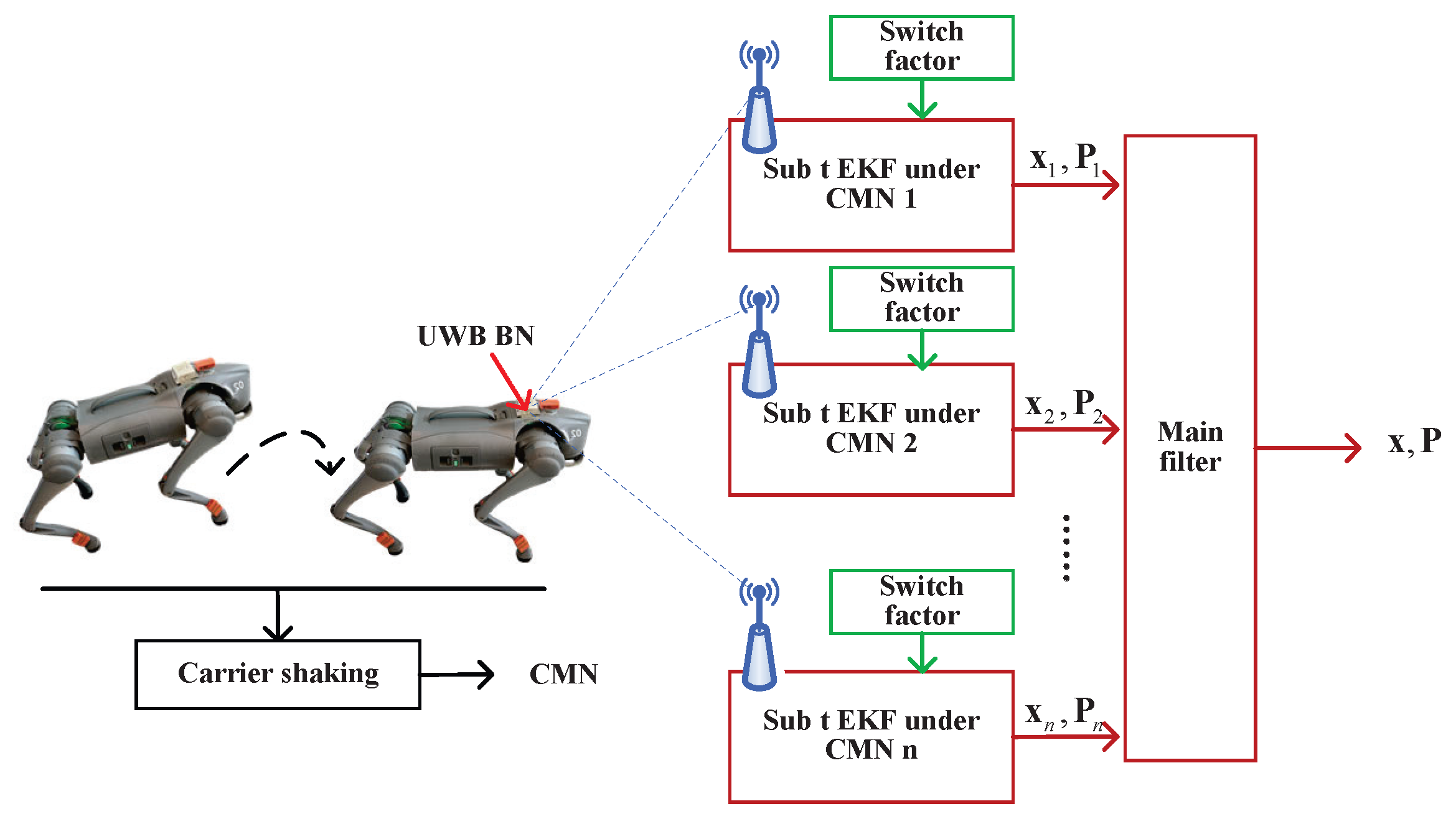 - A distributed UWB localization framework is introduced. It employs the position and velocity of a robotic dog as the state vector and the range measurement from a UWB reference node (RN) to the target blind node (BN) as the measurement vector. Filter submodules independently determine the position information of the target robotic dog, while the main filter performs hierarchical data fusion of the distributed estimates.