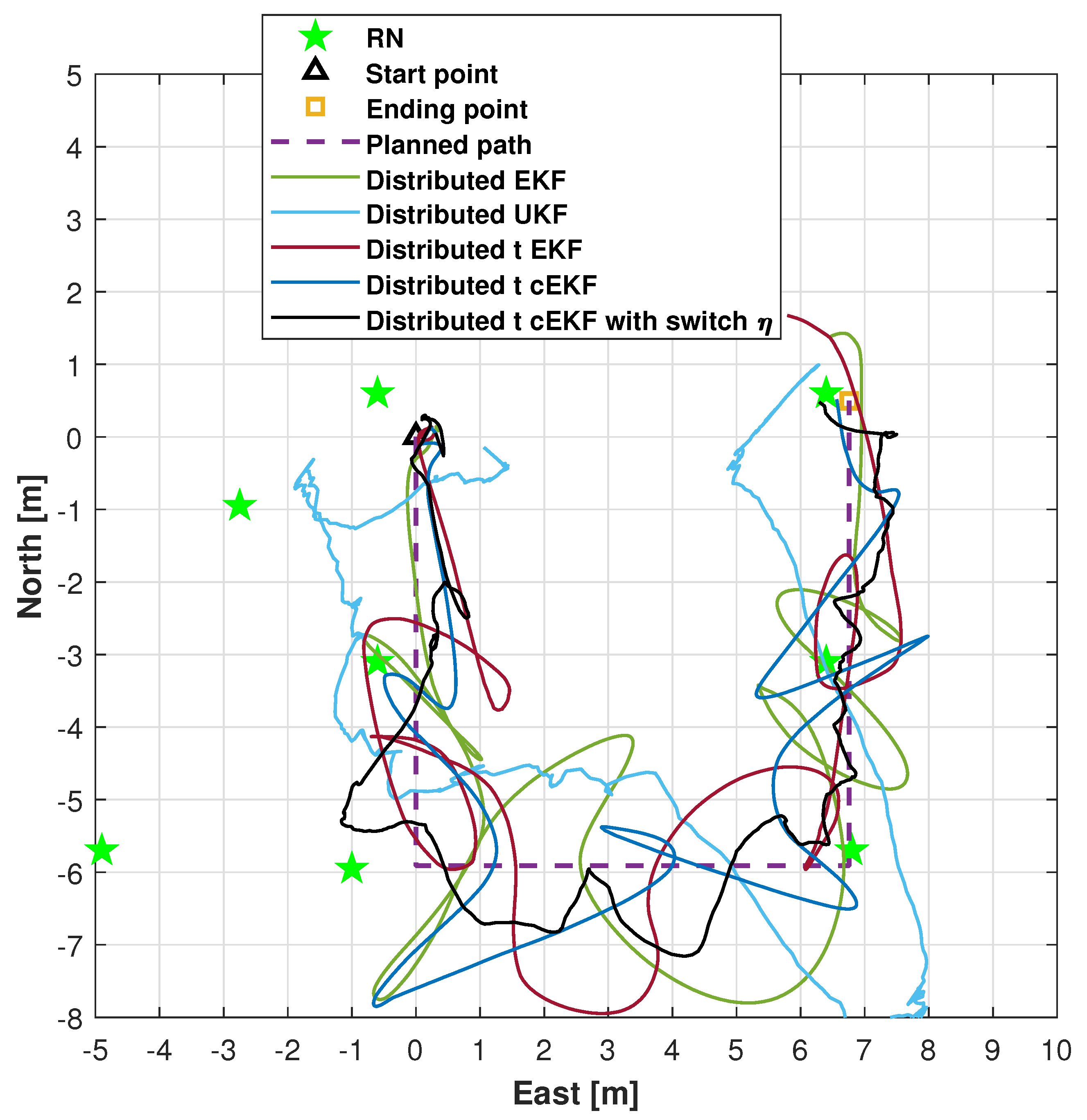 - Gao, Y.; Yang, M.; Zang, X.; Deng, L.; Li, M.; Xu, Y.; Sun, M. Adaptive Distributed Student’s T Extended Kalman Filter Employing Allan Variance for UWB Localization. Sensors 2025, 25, 1883. [Google Scholar] [CrossRef]