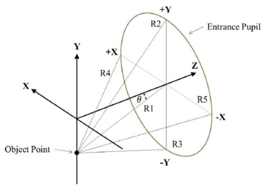 In the CODE V optical design software, each field of view is associated with five reference rays, denoted as R1, R2, R3, R4, and R5, as illustrated in Figure 1. Among them, R1 represents the chief ray, which passes through the center of the entrance pupil and forms an angle θ with the optical axis, corresponding to the half FOV. The remaining rays—R2, R3, R4, and R5—are marginal rays that pass through the top edge (+Y), bottom edge (−Y), left edge (+X), and right edge (−X) of the entrance pupil, respectively.