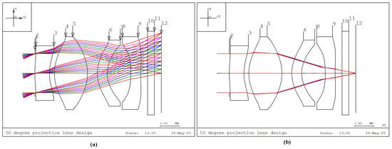 Ray trace diagrams of the 50° FOV collimating lens design. (a) Lens elements and reference rays in the Y–Z plane. (b) Lens elements and reference rays in the X–Z plane.