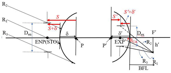 The exit pupil distance S′ can be calculated from the relationship between S and S′ and the EFL of the lens as shown in Equation (3) [16]: