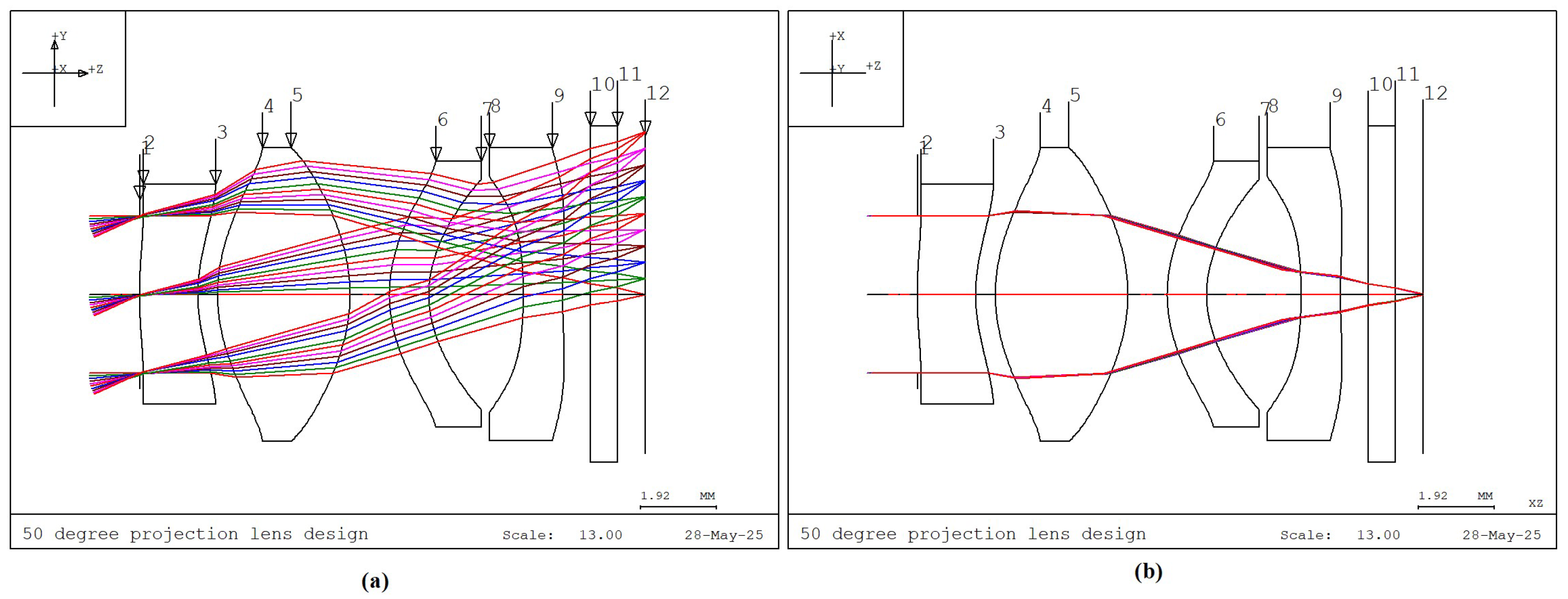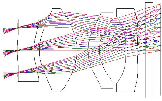 The maximum half FOV of 25° is defined as the full field (1.0 field) to define the clear aperture of the collimating lens system. To ensure uniform image quality, the 1.0 field is divided into 11 evenly spaced points for optimization, corresponding to 0.0, 0.1, 0.2, …, up to 1.0 field. In CODE V, the clear aperture of each lens surface is calculated by performing real ray tracing of five reference rays (R1 to R5) per field point, resulting in a total of 55 rays. The maximum footprint of these rays on each surface defines the required clear aperture of that surface. The collimating lens system in this study covers a FOV of 50°. It comprises four lens elements and one protective window, as illustrated in Figure 2. The optical axis is aligned with the Z-axis. Figure 2a shows the Y–Z cross-sectional view of the lens system and the ray traces for reference rays R1, R2, and R3 across all fields (a total of 33 rays). Figure 2b shows the X–Z plane, which includes reference rays R4 and R5 (a total of 22 rays). Hence, to fully determine the clear aperture of each lens surface, ray tracing of all 55 reference rays is required.