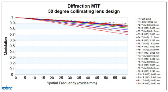 Modulation Transfer Function (MTF) curve of the FOV 50° collimating lens design at a spatial frequency of 62 cycles/mm.