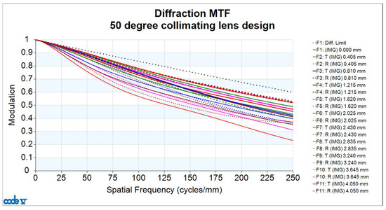 Modulation Transfer Function (MTF) curve of the FOV 50° collimating lens design at a spatial frequency of 250 cycles/mm.