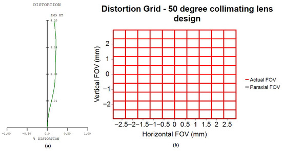 Optical distortion curve for 50-degree FOV collimating lens. (a) the optical distortion plot; (b) the corresponding distortion grid chart.