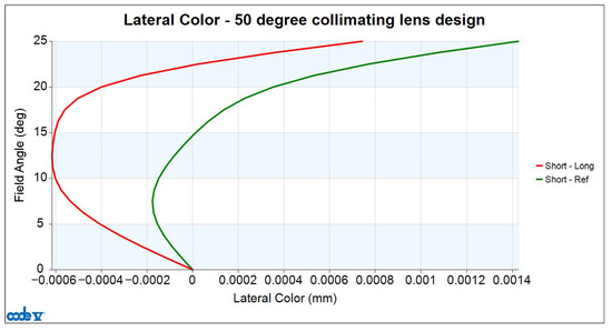 Lateral chromatic aberration is defined as the difference in image height on the imaging plane when tracing real light rays of different wavelengths. The lens design presented in this paper is based on three wavelengths: a short wavelength (F-line, 0.4861 µm), a reference wavelength (d-line, 0.5876 µm), and a long wavelength (C-line, 0.6563 µm). The design values for lateral color are shown in Figure 10. In this figure, the horizontal axis represents lateral color in mm, and the vertical axis represents the half-field angle in degrees. The red curve represents the lateral color values for the short and long wavelengths across different field angles. The maximum value of the red curve occurs at a half FOV of 25°, with a value of 0.742 µm. The green curve represents the lateral color values for the short and reference wavelengths. The maximum value of the green curve occurs at a half FOV of 25°, with a value of 1.426 µm. Lateral chromatic aberration must be smaller than the microdisplay pixel size of 8.1 µm; otherwise, the lens will be unable to resolve it, and lateral chromatic aberration will occur easily. The lateral chromatic aberration of the collimator designed in this paper is much smaller than the microdisplay pixel size of 8.1 µm, so the lateral chromatic aberration value can be ignored.