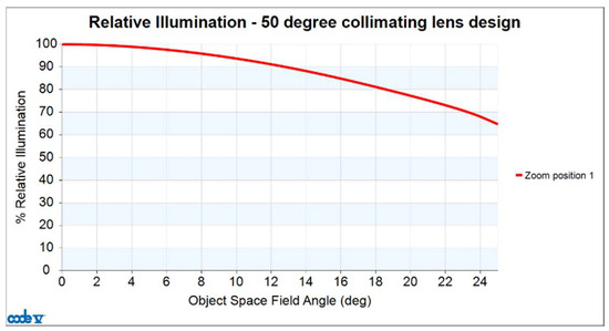 Finally, the relative illumination curve is shown in Figure 11. The red curve shows the relative illumination values at different half-field angles. In this design, the relative illumination is greater than 65%.