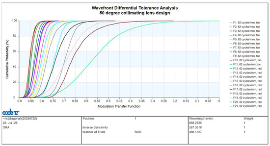 The cumulative distribution probability curve for tolerance analysis is found by combining the effects of all tolerance items. The vertical axis represents the cumulative distribution probability, and the horizontal axis represents the MTF. Tan stands for tangential direction, and rad stands for sagittal direction. At a cumulative probability of 97.7%, the lowest MTF value at a spatial frequency of 62 cycles/mm for the tolerances at the 1.00 field tan position is 0.3023, as shown in Figure 12. Except for the 0-degree field of view, the MTF curve is affected by astigmatism in other fields of view, and its tangential and sagittal MTF curves will be different. The maximum paraxial image height of 4.05 mm is defined as the 1.0 field of the collimating lens system. To ensure uniform image quality, the 1.0 field is divided into 11 evenly spaced points, corresponding to 0.0, 0.1, 0.2, …, up to 1.0 field. F1, F2, …, F11 are represented by tangential fields of view of 0.0, 0.1, 0.2, …, 1.0, respectively; and F12, F13, …, F21 are represented by radial fields of view of 0.1, 0.2, …, 1.0, respectively. In the tolerance analysis, we analyze each field of view, including tangential and radial values. We perform tolerance analysis on F1 to F21 in various directions across different fields of view, using different colors to represent each.