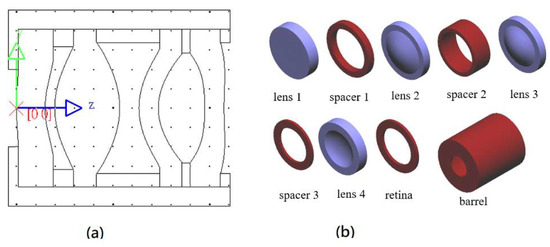 Assembly structure diagram of the internal optical and mechanical components of the lens. (a) a perspective view of the assembled lens; (b) internal components of the lens include four lenses, three spacers, one retina, and barrel.