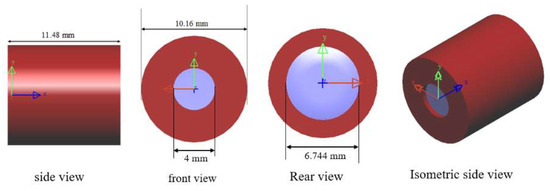 Table 8 shows the volume and weight of the various optical and mechanical components within the lens. The barrel, made of PMMA plastic, serves as the lens housing. It has a mass of 0.4132 g, an outer diameter of 10.156 mm, and a length of 11.48 mm. The inner ring is hollow with an inner diameter of 8.156 mm. The barrel ring’s thickness is fixed at 1 mm. The three-piece spacer structure is a mechanical component in the form of a ring that fixes the two lenses. It is made of an aluminum magnesium alloy. The retina is the ring structure that locks the final lens in place. It is made of PMMA plastic. The four lenses, three spacers, and one retina are finally assembled into the barrel, resulting in a total mass of 1.089 g. Figure 14 shows the 3D image and dimensions of the lens. The lens is a cylinder with a radius of 5.08 mm and a length of 11.48 mm; the resulting lens volume is 0.931 cm3.