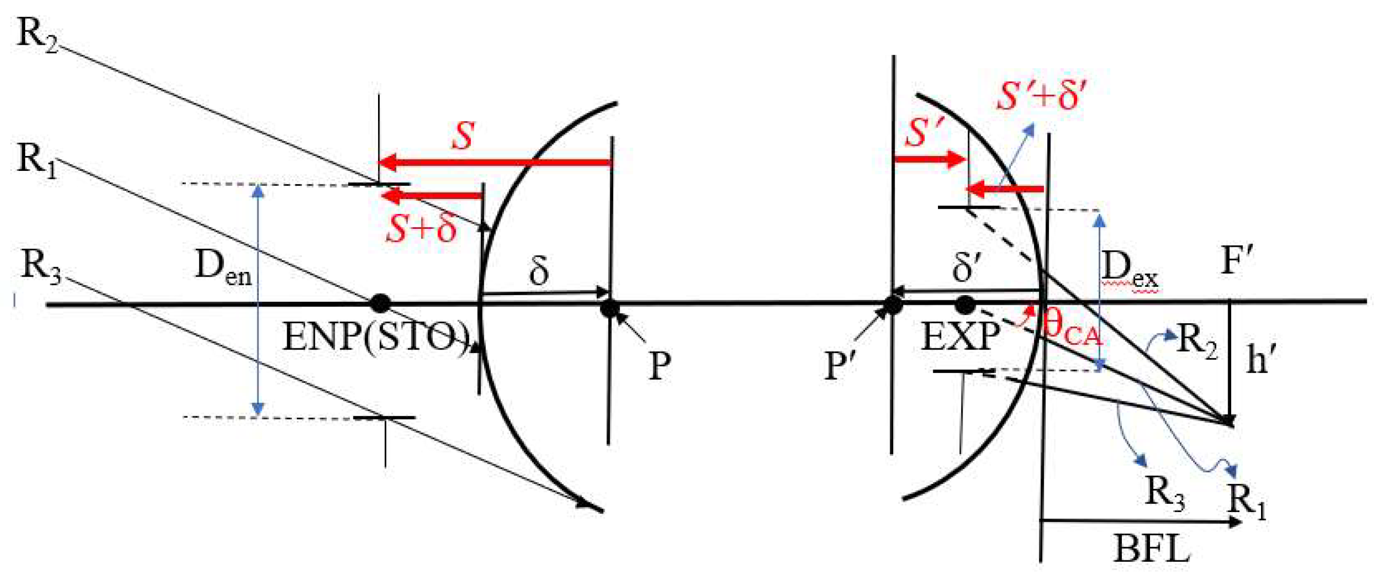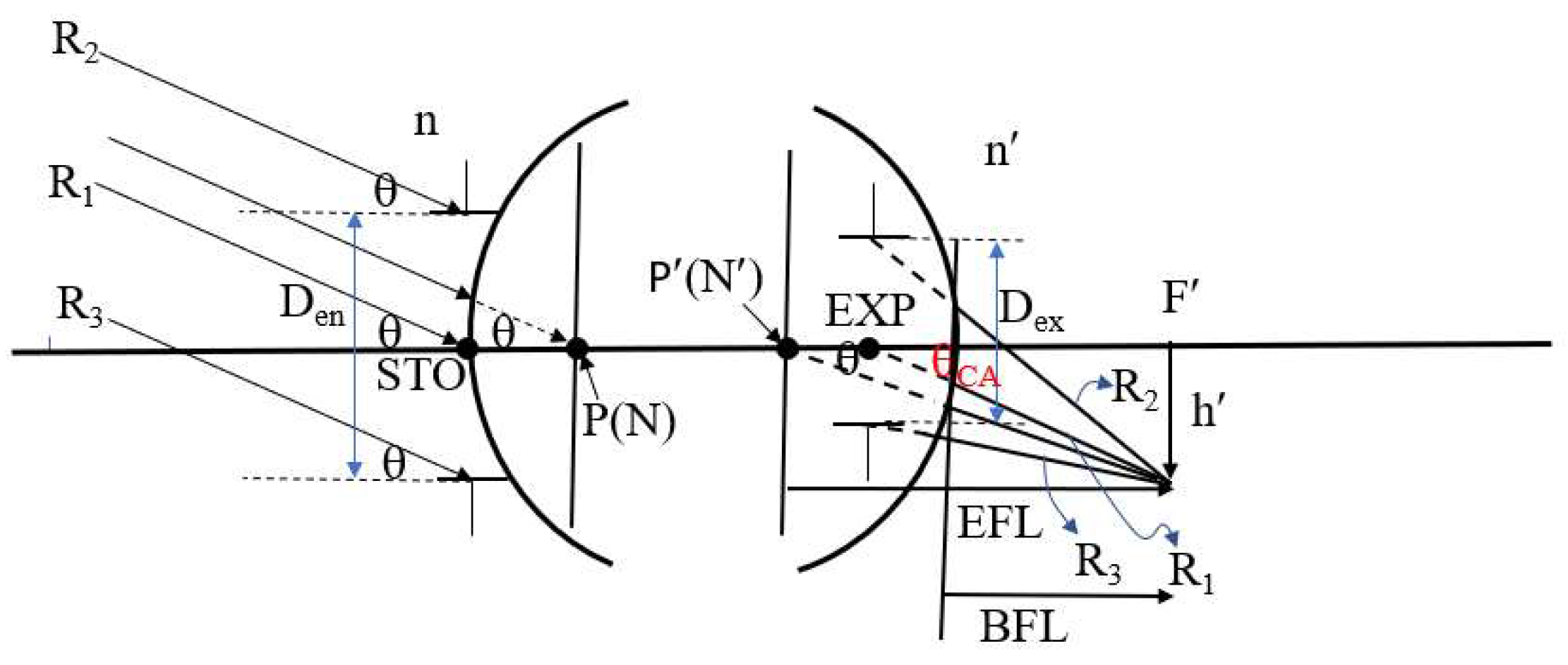 Figure 3 illustrates the relationships among half FOV, image height, effective focal length (EFL), and entrance pupil diameter. Points P and P′ denote the first and second principal points, respectively, while N and N′ denote the first and second nodal points. The symbols n and n′ represent the refractive indices of the object and image spaces, respectively. F′ denotes the rear focal point, h′ represents the image height, and STO indicates the position of the aperture stop. In this system, the aperture stop is located on the first surface of the lens, causing the entrance pupil to coincide with the aperture stop. EXP indicates the exit pupil position, while Den and Dex represent the diameters of the entrance and exit pupils, respectively. The symbol θCA refers to the chief ray angle in the image space. EFL is the lens’s effective focal length, and BFL is the back focal length. Assuming that the object space half FOV is denoted by θ, and the object is located at infinity, then the chief ray, marginal ray, and the ray passing through the first principal point (P) will all make the same angle θ. If the object space and image space refractive indices (n and n′) are equal (typically air), then the first principal point P coincides with the first nodal point N, and the second principal point P′ coincides with the second nodal point N′. Due to the nodal point property, the incident angle at N equals the emergent angle at N′, thereby establishing the following relationship between image height h′ and the effective focal length EFL, as shown in Equation (1)