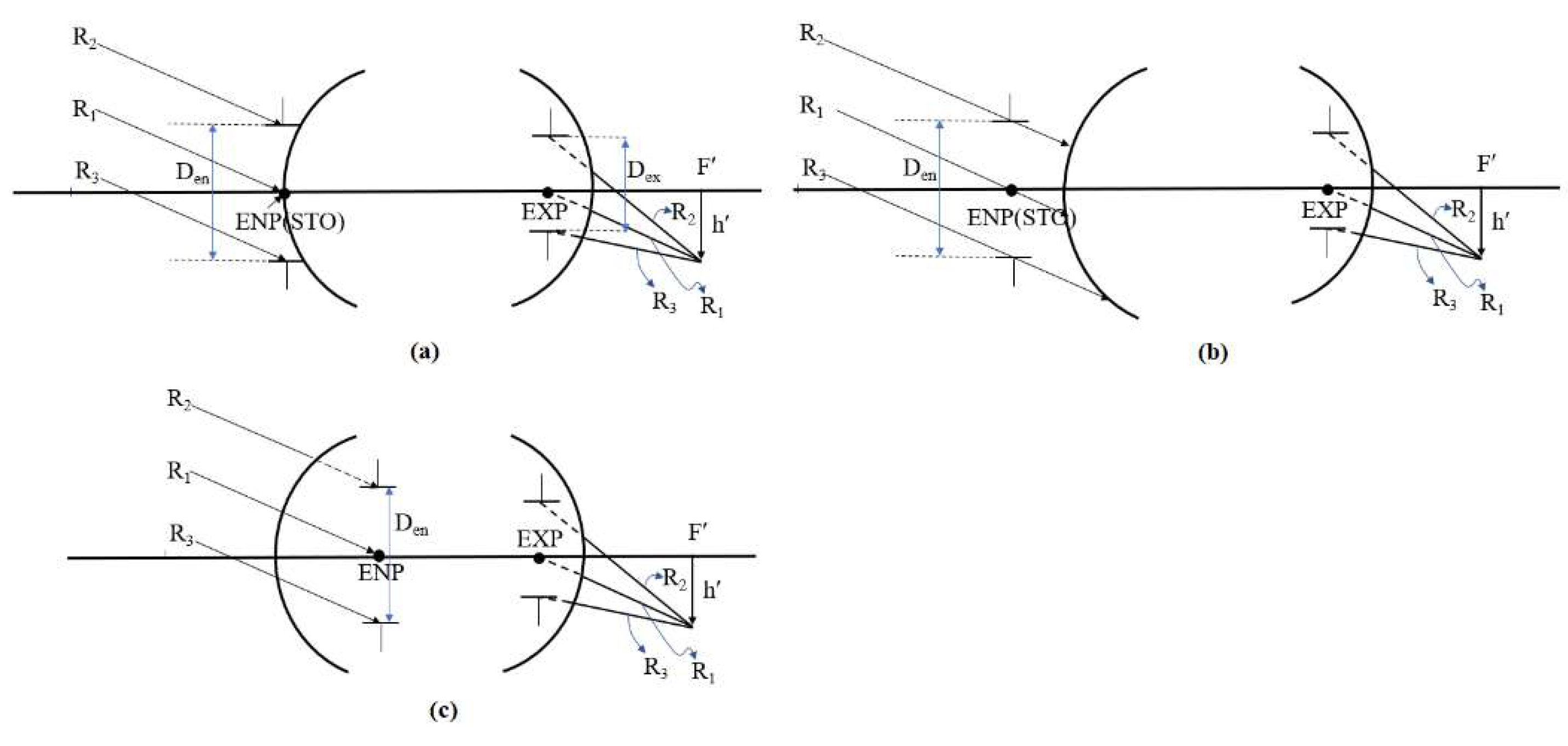 The aperture stop location and size determine the minimum clear aperture of a lens system. When the aperture stop is placed on the first surface or before the lens, the entrance pupil (ENP) coincides with the aperture stop. Its size is identical to that of the aperture stop, and directly determines the clear aperture of the first lens, which in turn influences the clear aperture of the second lens, as illustrated in Figure 4. As shown in Figure 4a, with the aperture stop on the first surface of lens, the minimum clear aperture occurs on the first lens. Figure 4b shows the aperture stop before the lens, where the entrance pupil coincides with the aperture stop. The ray height of reference ray R3 on the first surface of the lens is larger than the entrance pupil radius. If the aperture stop position moves toward the object space, the farther the distance the aperture stop is from the first surface of the lens, the greater the ray height of reference ray R3 on the first surface, and a larger clear aperture of the first lens, and increasing the overall lens volume. Figure 4c shows the entrance pupil behind the first surface, which no longer coincides with the aperture stop. The ray height of reference ray R2 on the first surface of the lens is larger than the entrance pupil radius. If the entrance pupil position moves toward the image space, the farther the entrance pupil is from the first surface, the greater the ray height of reference ray R2 on the first surface, and a larger clear aperture of the first lens, increasing the overall lens volume.