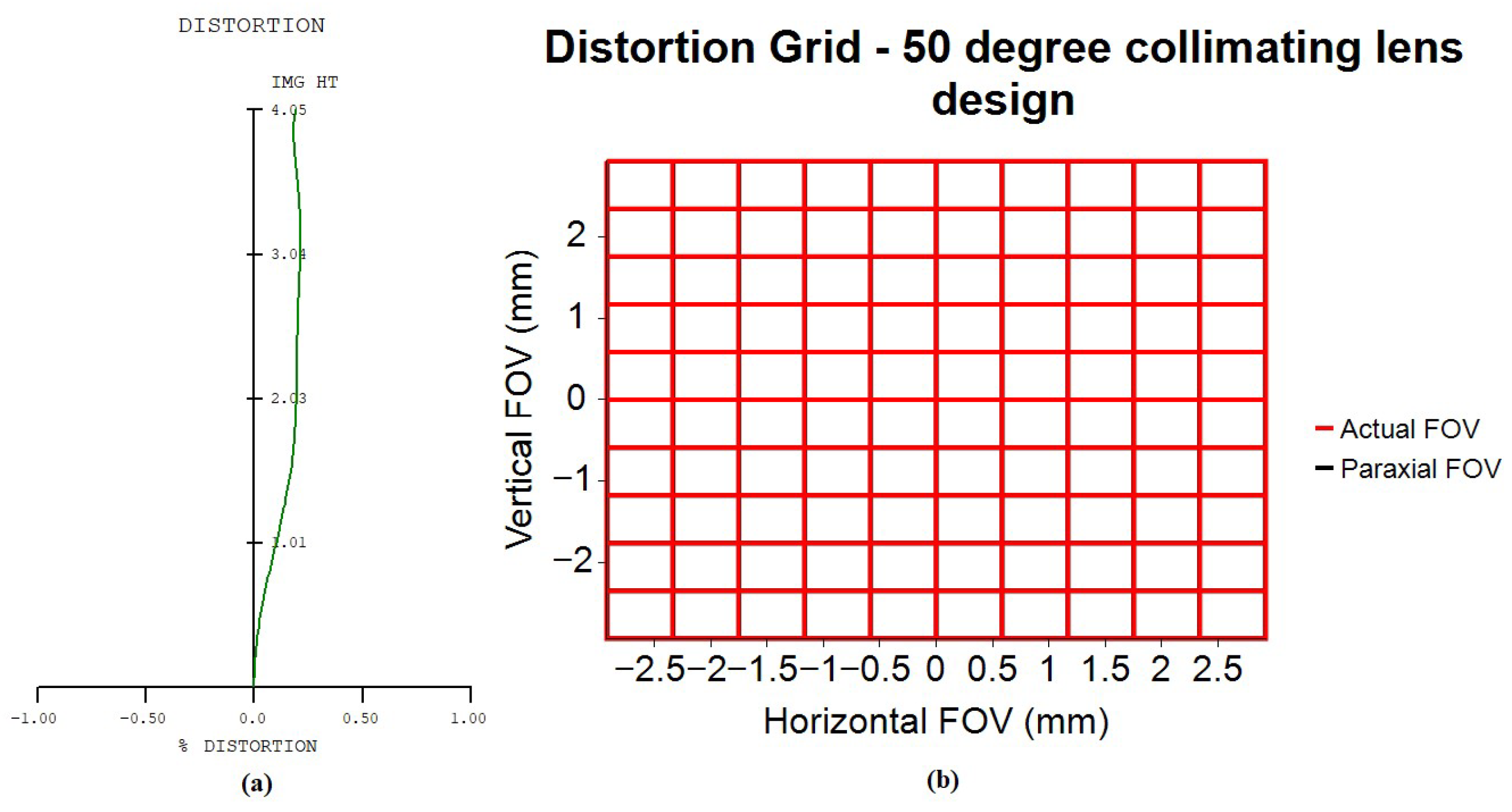 Figure 9a shows the optical distortion plot for the collimating lens design. The maximum optical distortion is 0.2128%, occurring at the 0.8 field position. The TV distortion, defined as the absolute difference between the maximum and minimum optical distortion values from the 0.6 to 1.0 field region, is 0.0195%. Figure 9b presents the corresponding distortion grid chart. The horizontal and vertical axes represent the image heights in the horizontal and vertical directions. The black curve illustrates the variation in paraxial image height, while the red curve represents the actual image height. The collimator design in this study exhibits minimal TV distortion (0.0195%), resulting in a straight red curve without distortion. In addition, the collimator design in this article also exhibits minimal optical distortion (0.2128%), allowing the red curve to overlap with the black curve, making the black curve effectively invisible.