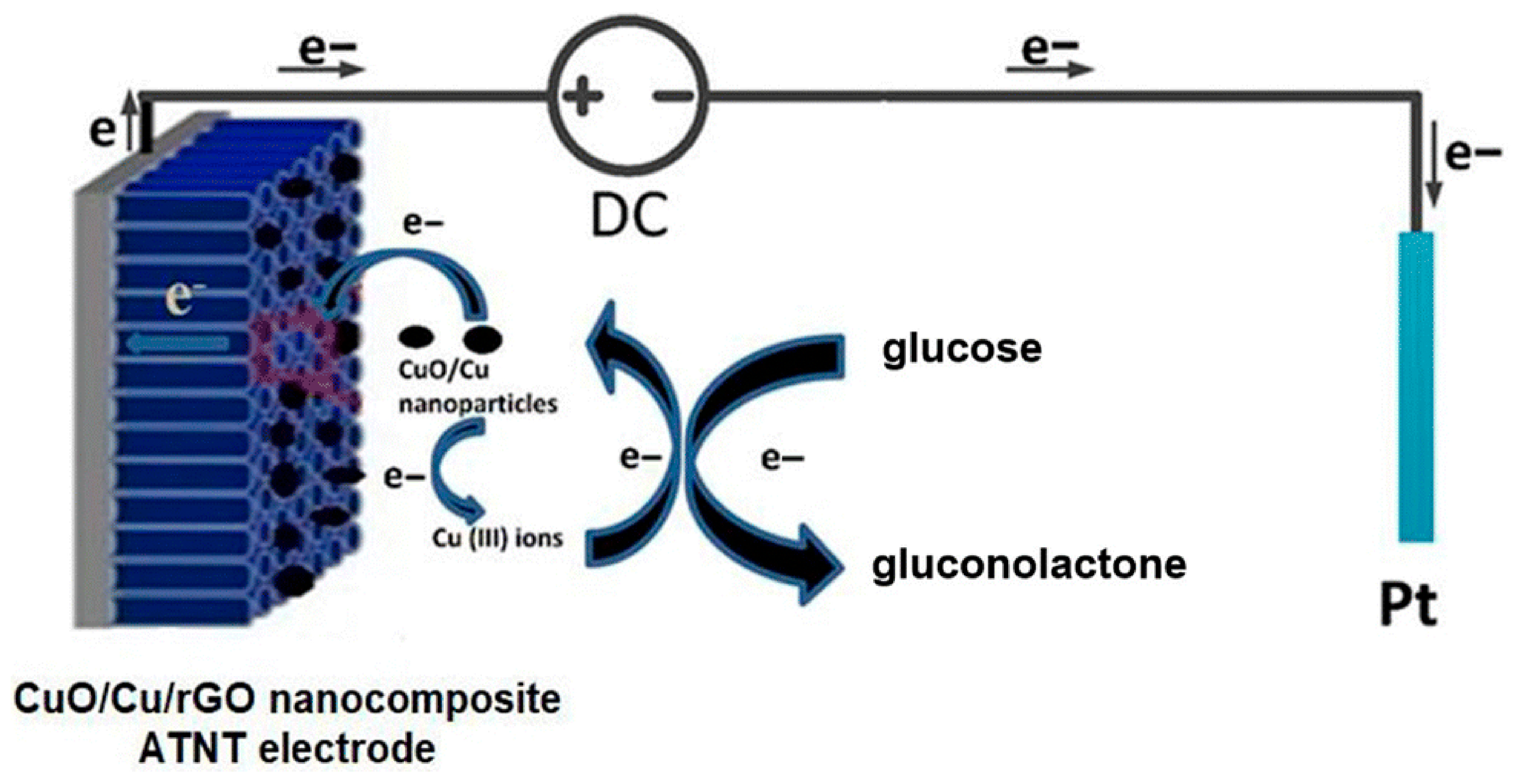 - Chahrour, K.M.; Ooi, P.C.; Nazeer, A.A.; Al-Hajji, L.A.; Jubu, P.R.; Dee, C.F.; Ahmadipour, M.; Hamzah, A.A. CuO/Cu/rGO Nanocomposite Anodic Titania Nanotubes for Boosted Non-Enzymatic Glucose Biosensors. New J. Chem. 2023, 47, 7890–7902. [Google Scholar] [CrossRef]