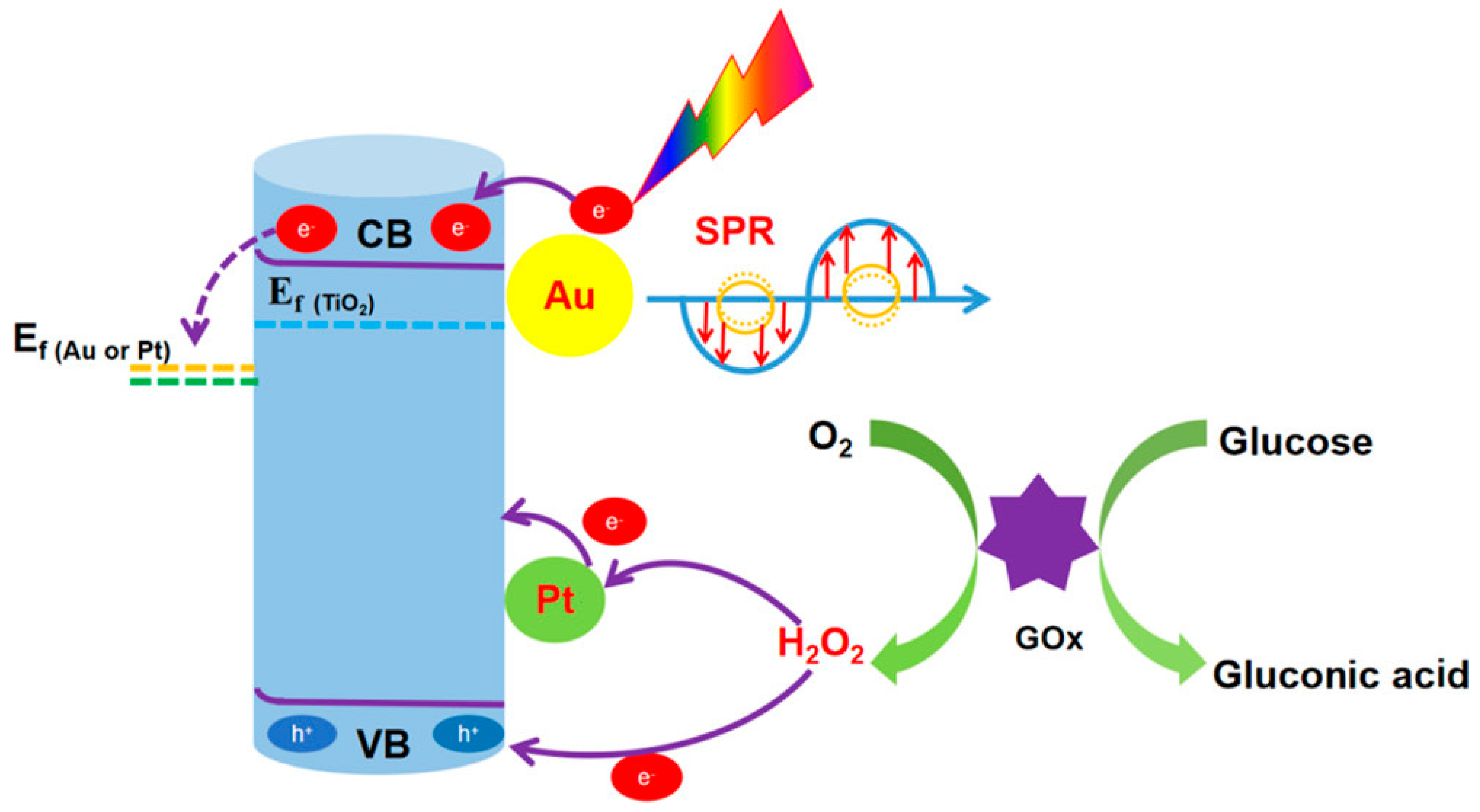 - Yang, Z.; Xu, W.; Yan, B.; Wu, B.; Ma, J.; Wang, X.; Qiao, B.; Tu, J.; Pei, H.; Chen, D.; et al. Gold and Platinum Nanoparticle-Functionalized TiO2 Nanotubes for Photoelectrochemical Glucose Sensing. ACS Omega 2022, 7, 2474–2483. [Google Scholar] [CrossRef]