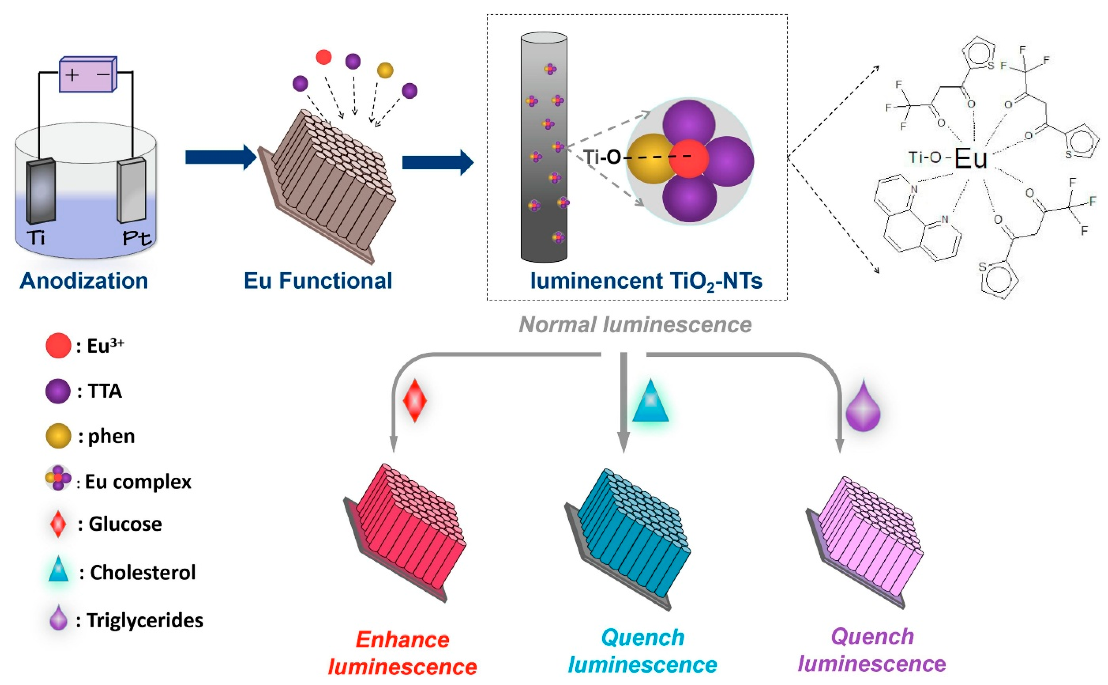 - Su, B.; Yang, W.; Wang, Y.; Huang, L.; Popat, K.C.; Kipper, M.J.; Belfiore, L.A.; Tang, J. Europium-Functionalized Luminescent Titania Nanotube Arrays: Utilizing Interactions with Glucose, Cholesterol and Triglycerides for Rapid Detection Application. Mater. Sci. Eng. C 2020, 114, 111054. [Google Scholar] [CrossRef] [PubMed]