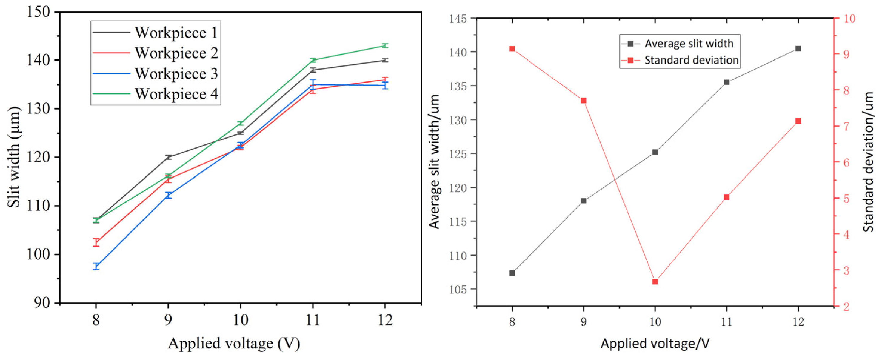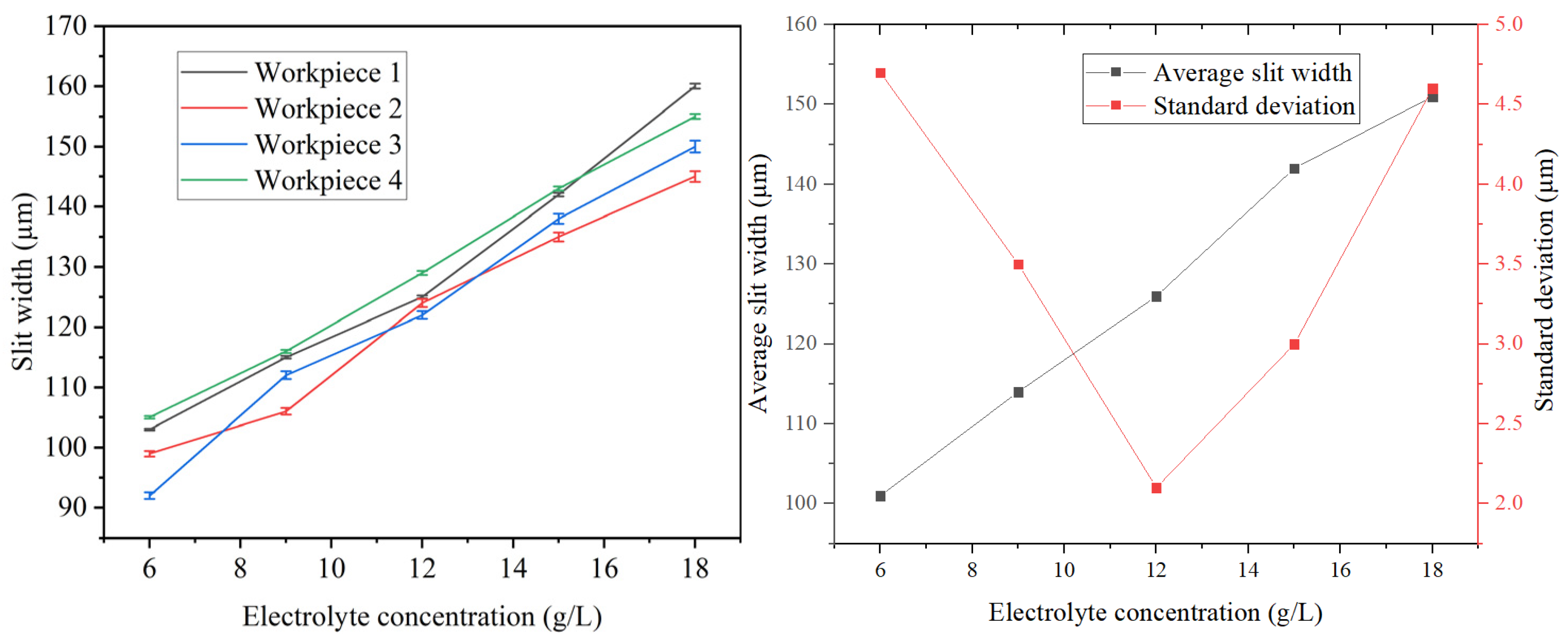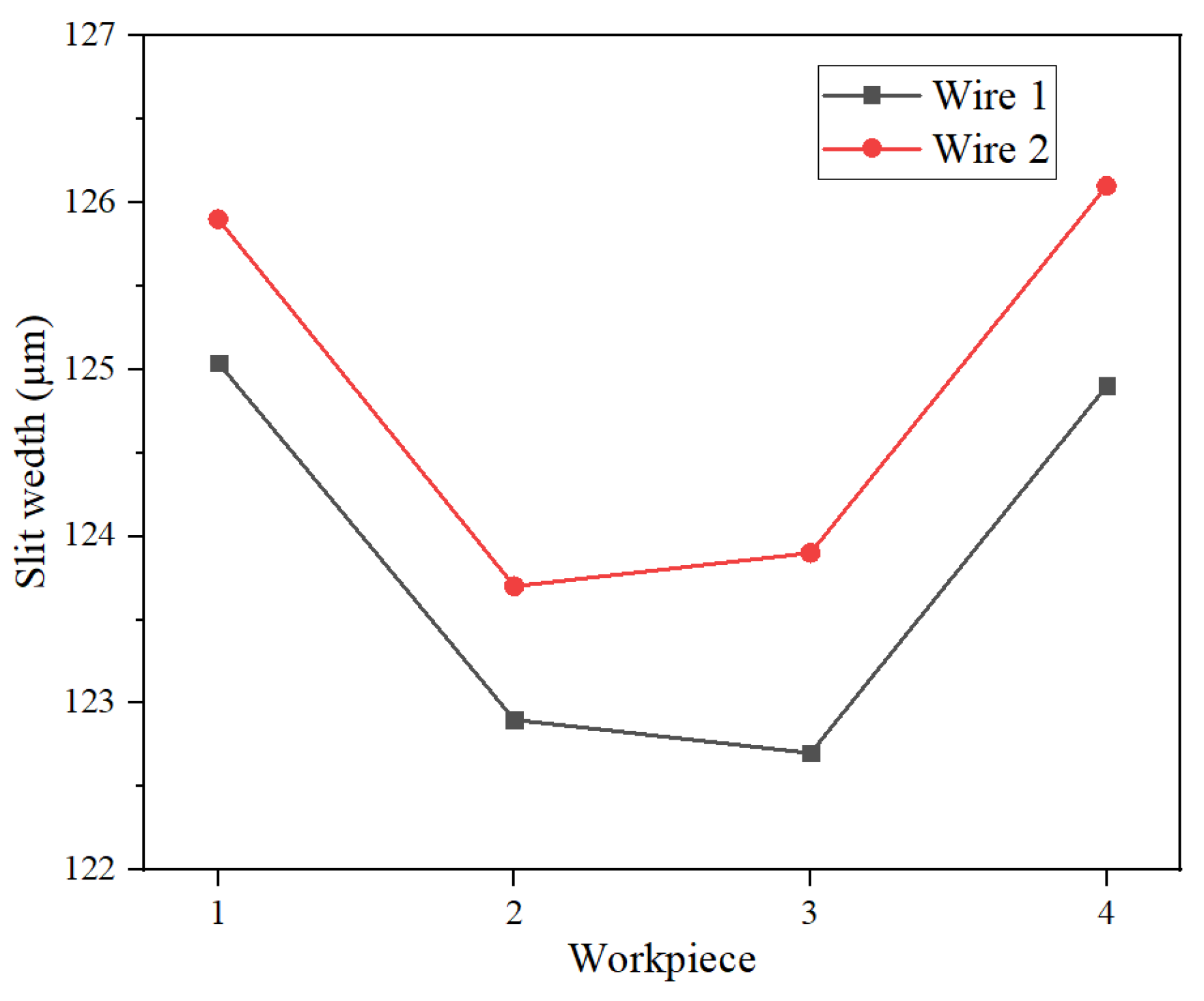 - Using the lateral flushing method, the influence of main process parameters on the consistency of slit width was studied. The variables tested include feed rate, voltage, frequency, duty cycle, and electrolyte concentration. Finally, the optimal processing parameters were determined.