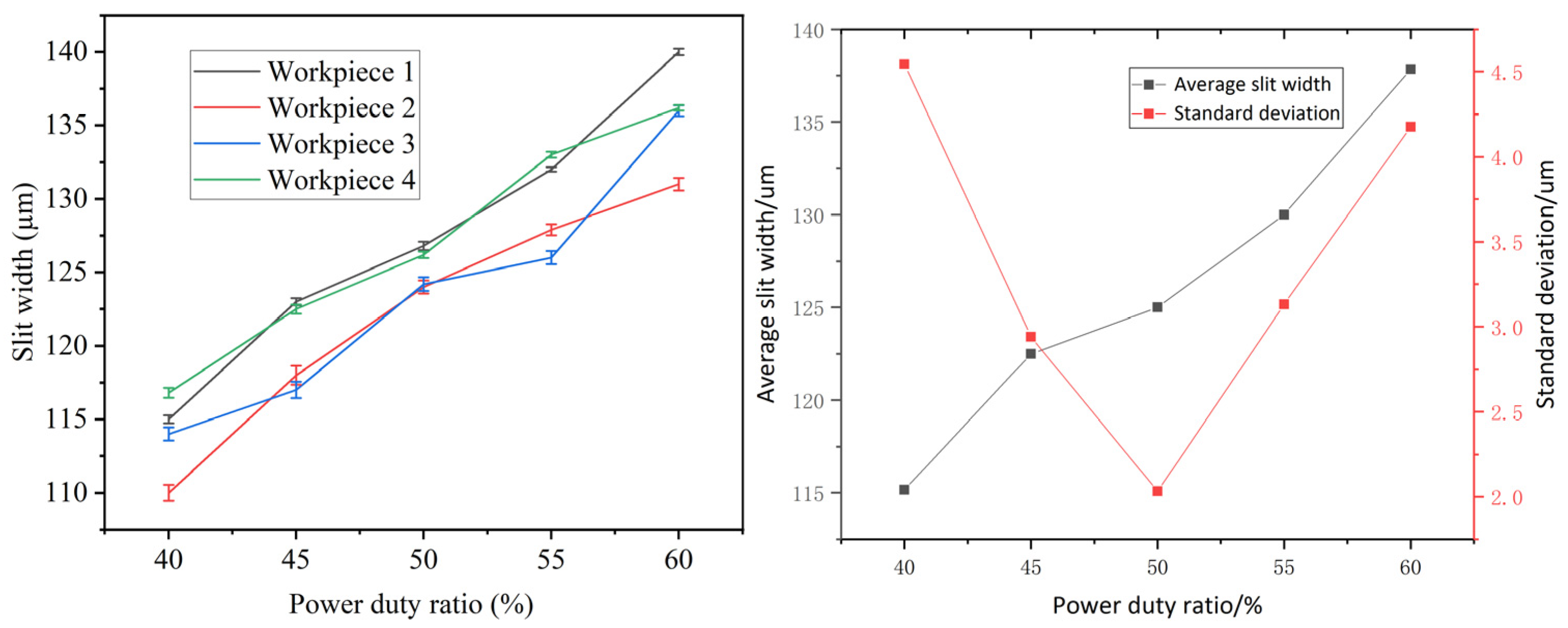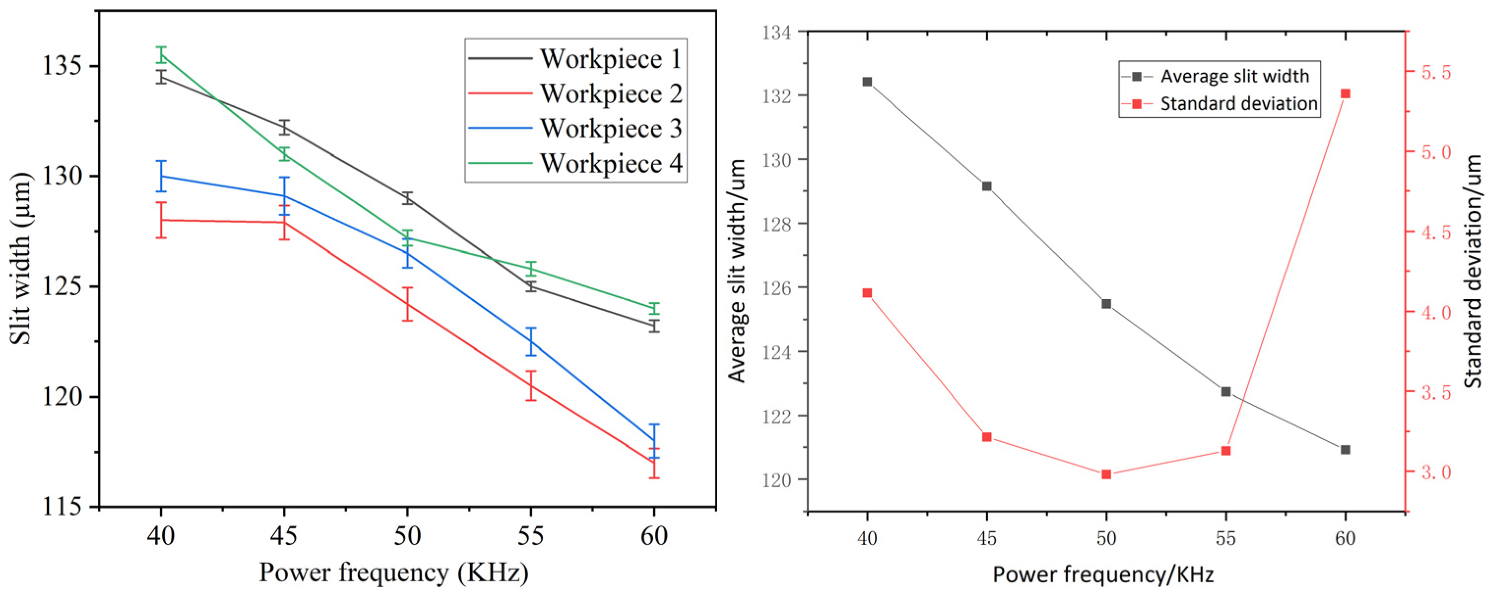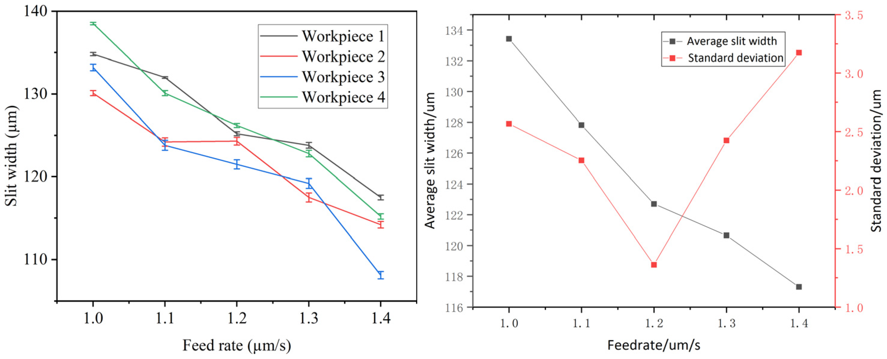 - Using the lateral flushing method, the influence of main process parameters on the consistency of slit width was studied. The variables tested include feed rate, voltage, frequency, duty cycle, and electrolyte concentration. Finally, the optimal processing parameters were determined.
