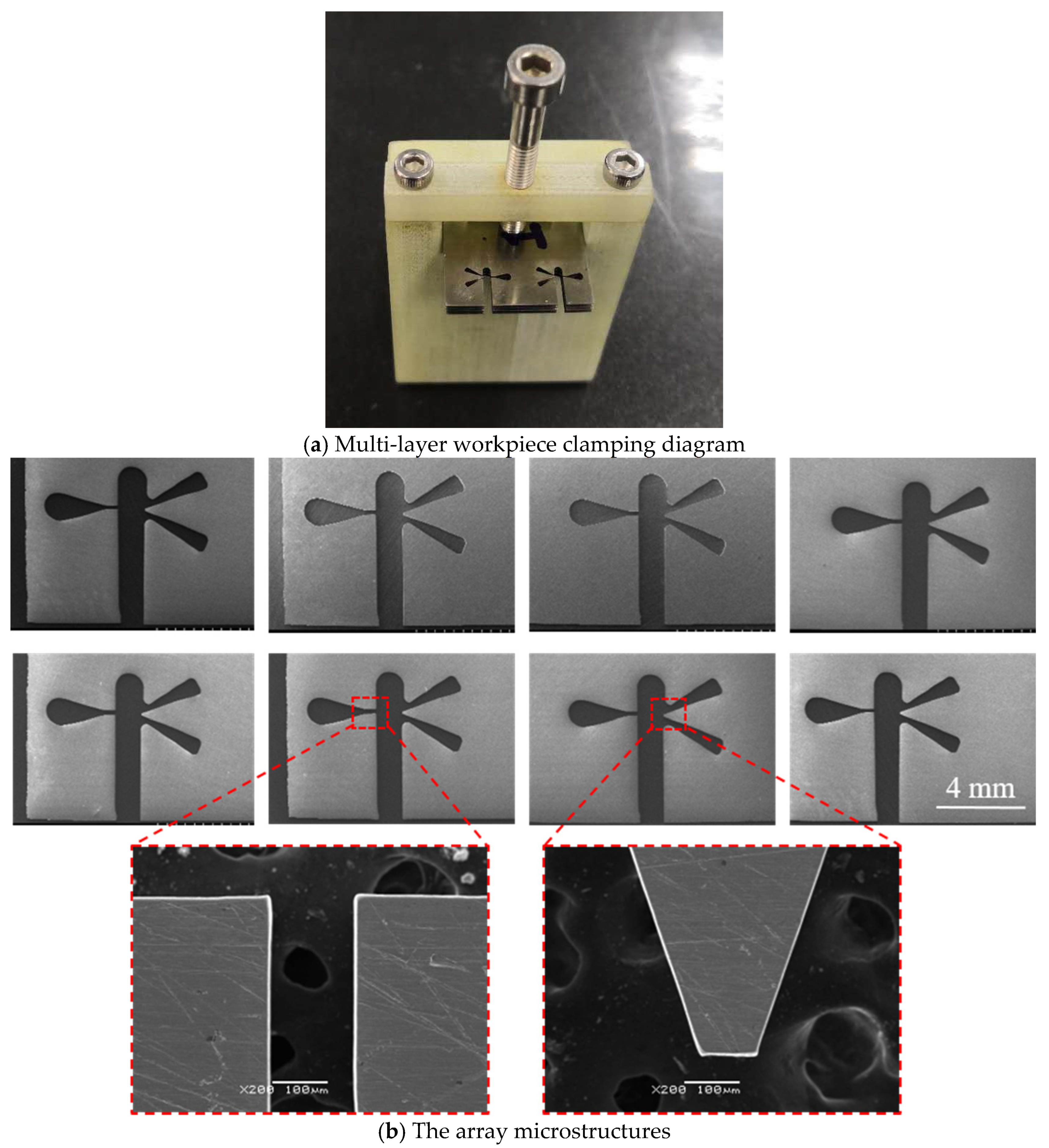 - Utilizing the optimized parameters, specifically a feed rate of 1.2 µm/s, arrayed microstructures were successfully fabricated, achieving an overall processing rate of 9.6 µm/s. The results demonstrate that MWECM significantly enhances machining efficiency compared to conventional wire electrochemical micromachining (WECM).