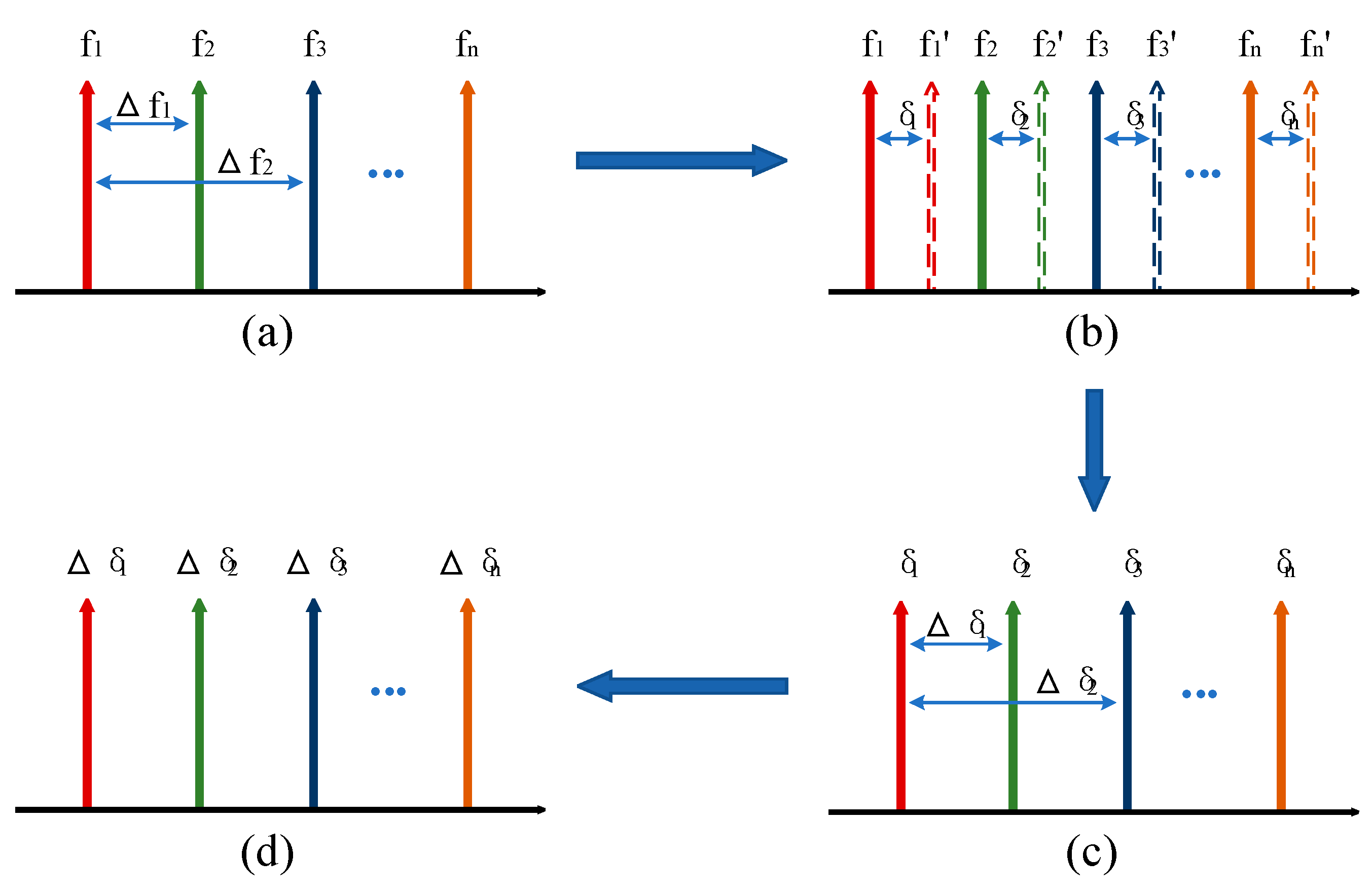 Principle of multi-wavelength differential Doppler velocimetry. (a) Optical frequency comb; (b) Reference signal and return signal. Among them, the solid arrow represents the reference signal, and the dashed arrow represents the return signal; (c) Doppler shift; (d) Differential Doppler shift. In the figure, represents different laser frequencies, denotes the different return laser frequencies after illuminating the moving object, indicates the Doppler shifts generated by different laser frequencies, and represents the differential Doppler shifts.