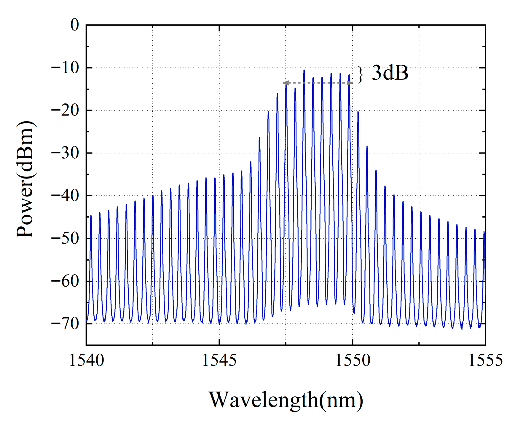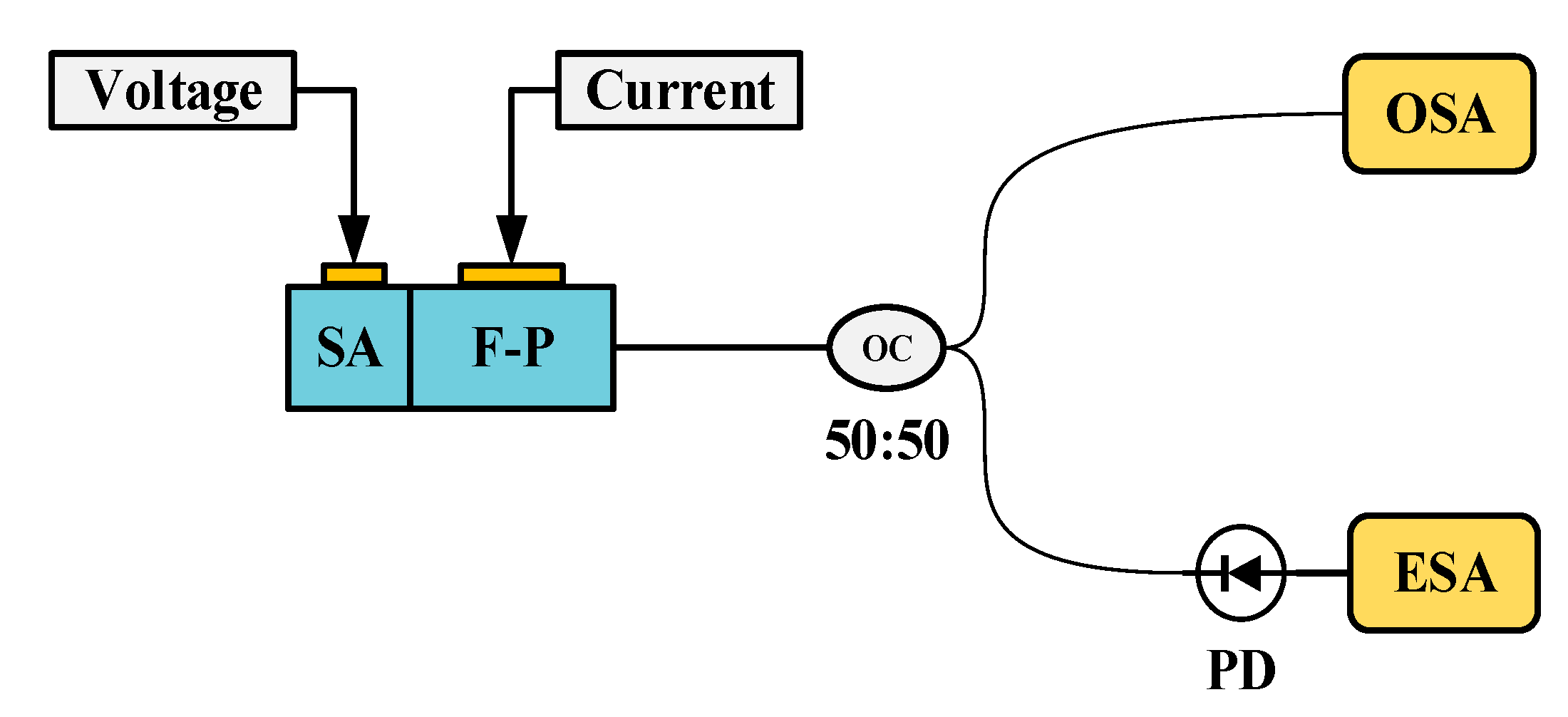 Figure 2, with a total length of 1000 μm, consisting of two functional regions. The front segment is a Fabry–Perot (F-P) resonant cavity, accounting for 97% of the laser’s length, which is mainly responsible for generating stable multi-mode laser output. The rear segment is a saturable absorption region (SA), occupying 3% of the total length of the laser, and is made of a semiconductor material with light intensity-sensitive characteristics: it exhibits low absorption when the incident light intensity is high, while showing strong absorption under low-light conditions. There is an electrical isolation region between the two functional regions to ensure the independence of their respective working states. The laser operates at a central wavelength of 1550 nm, and its operating temperature is precisely controlled at 25 °C ± 0.1 °C by a thermoelectric cooler (TEC).
