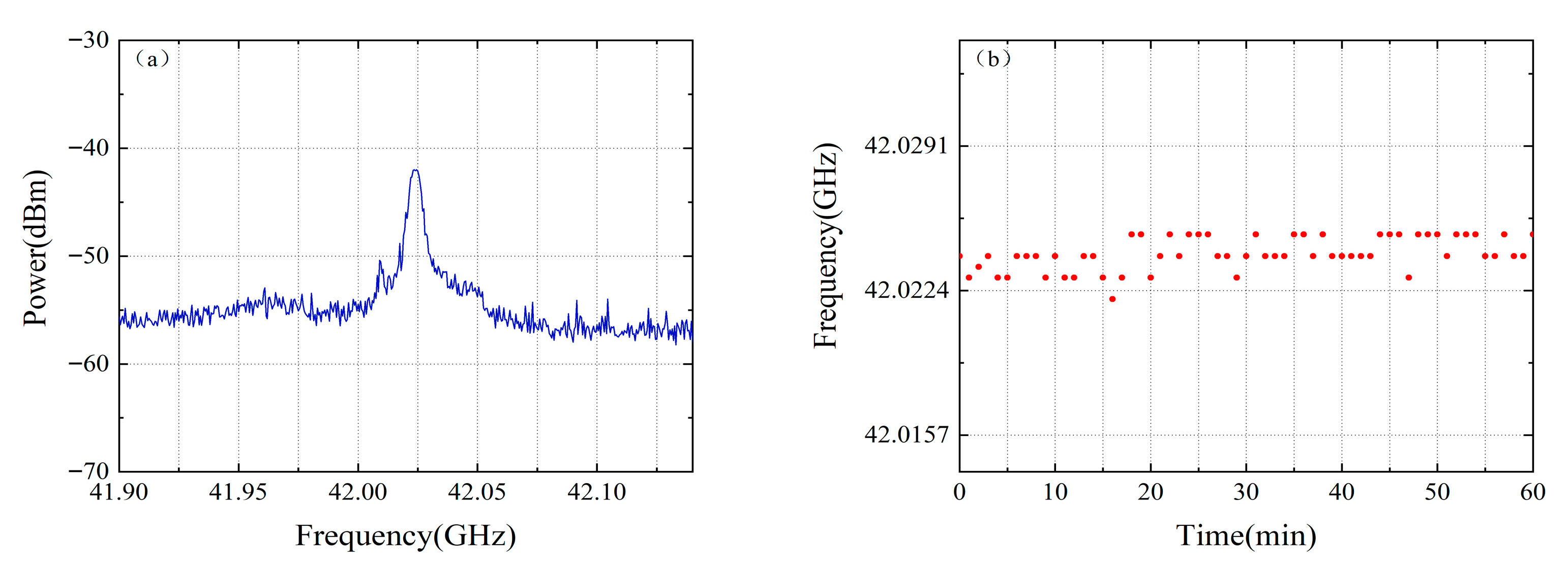 (a) Peak frequency stability measurement of the mode-locked laser beat note. (b) Long-term frequency stability test of the optical frequency comb’s beat signal (1 h). The blue curve represents the continuous one-hour monitoring of the maximum power of the beat signal from the mode-locked laser. The red dots indicate the beat frequency of the mode-locked laser recorded at one-minute intervals over the one-hour monitoring period.