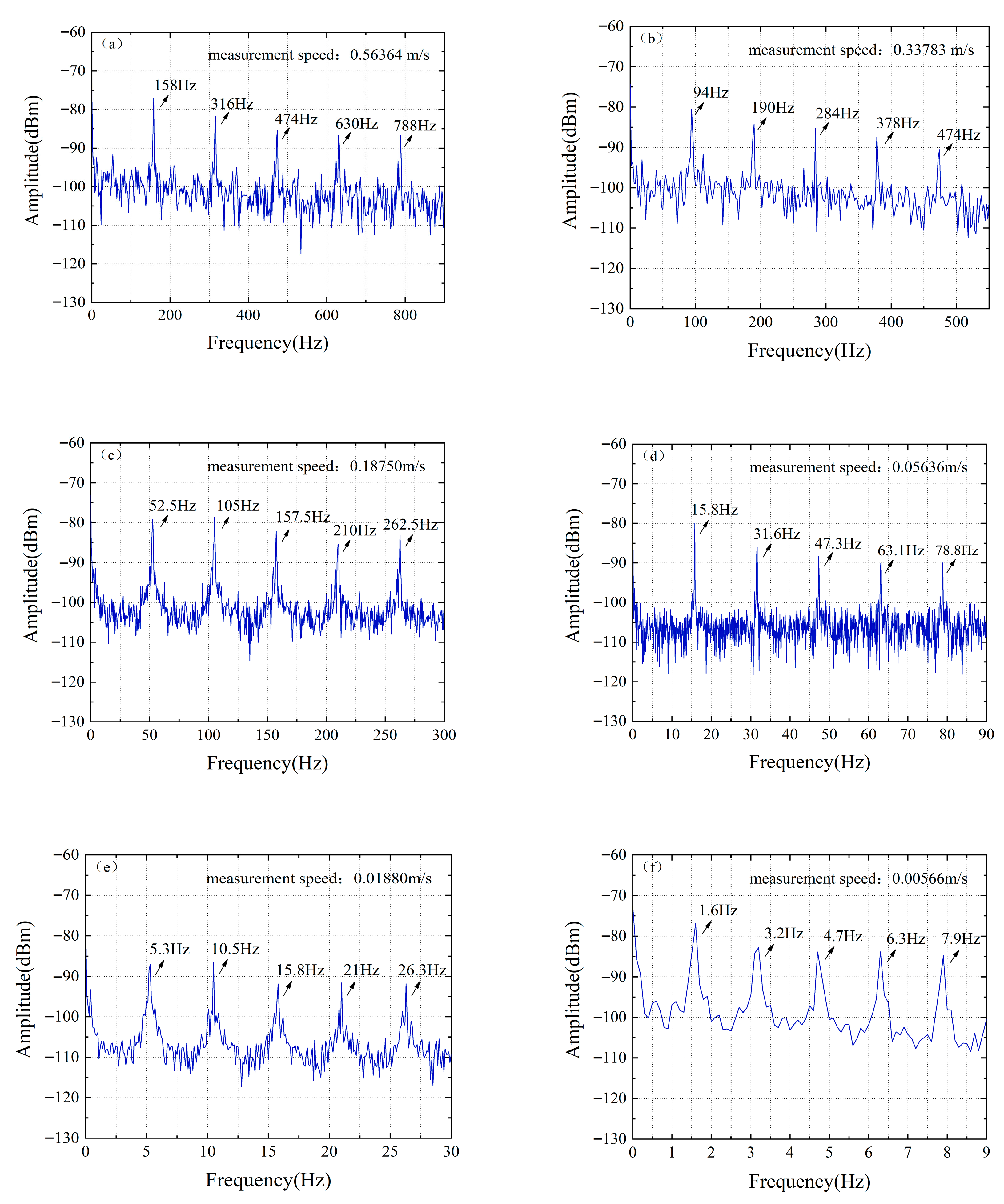 Figure 9. In the experiment, six speed points of 0.563 m/s, 0.337 m/s, 0.187 m/s, 0.0563 m/s, 0.0187 m/s, and 0.00563 m/s were selected for measurement. The results show that the six main modes of the mode-locked semiconductor laser produce five clear differential Doppler frequency components. Taking the measured speed of 0.337 m/s as an example, the system detected five characteristic frequencies of 94 Hz, 190 Hz, 284 Hz, 378 Hz, and 474 Hz, which correspond to the differential Doppler frequency shifts generated by the fundamental wave and harmonic components. This multi-frequency measurement mechanism realizes the cross-validation of speed information and significantly improves the measurement robustness of the system.