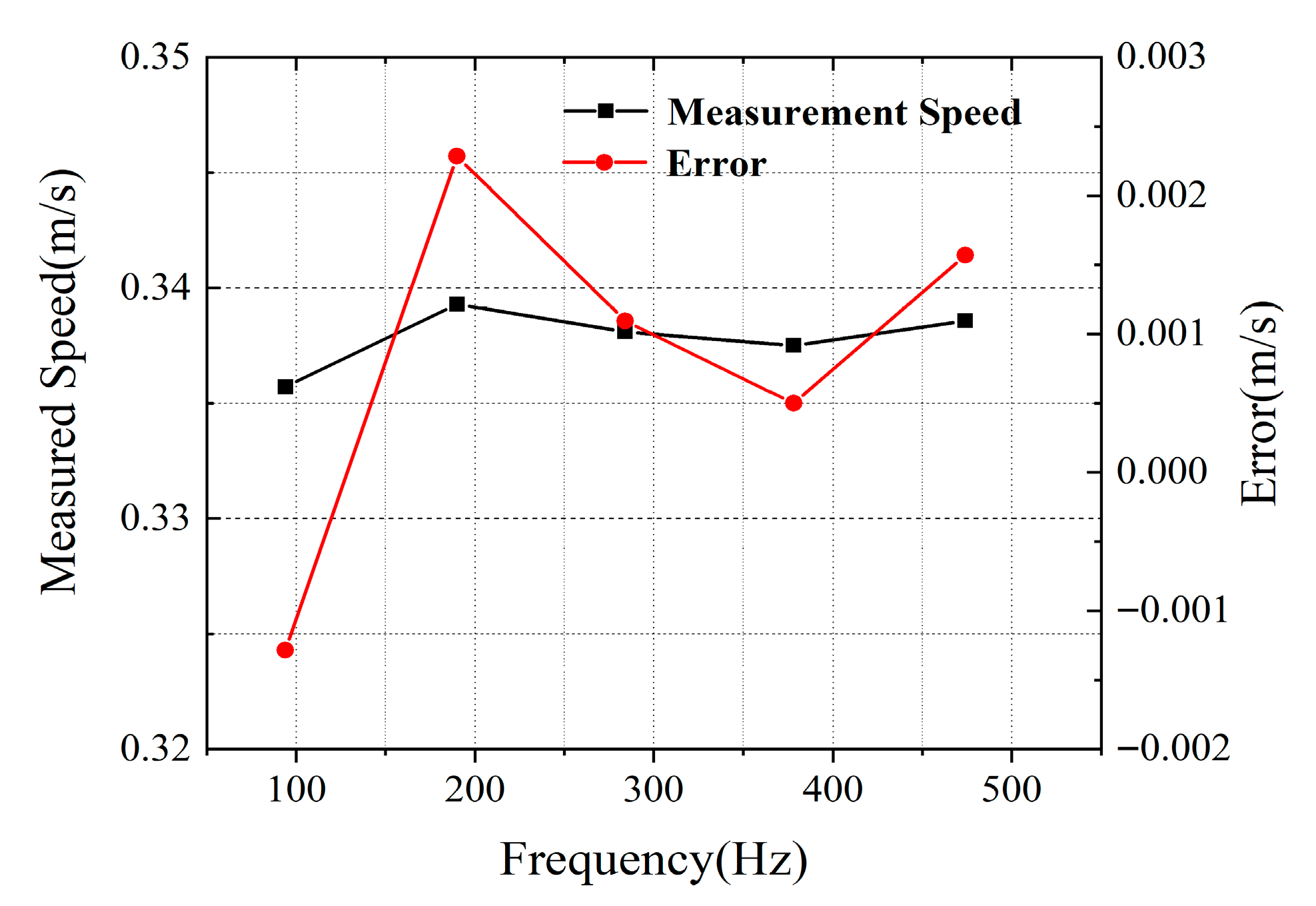 Figure 10 shows in detail the measurement results and error analysis of different comb teeth in the optical frequency comb when the target speed is 0.337 m/s. The experimental data show that the average measured speed calculated based on different comb teeth is 0.33783 m/s, with an absolute error of 0.00083 m/s and a relative error of only 0.2473%. This result verifies that the system can still maintain high measurement accuracy in low-speed measurement.