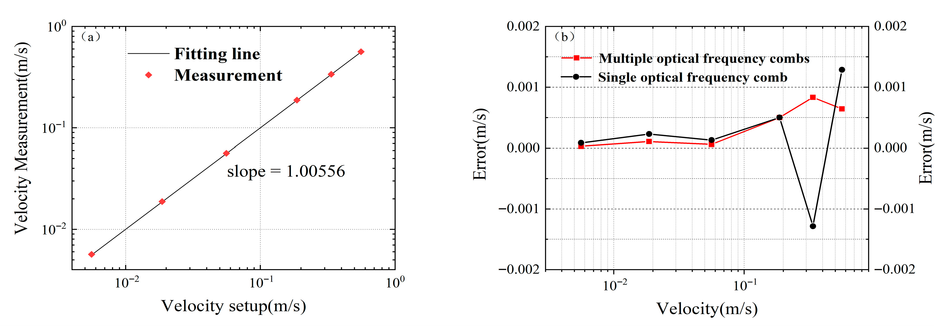 (a) Fitting curve of set speed and measured speed; (b) Measurement errors of single comb tooth speed measurement and multiple comb teeth speed measurement.