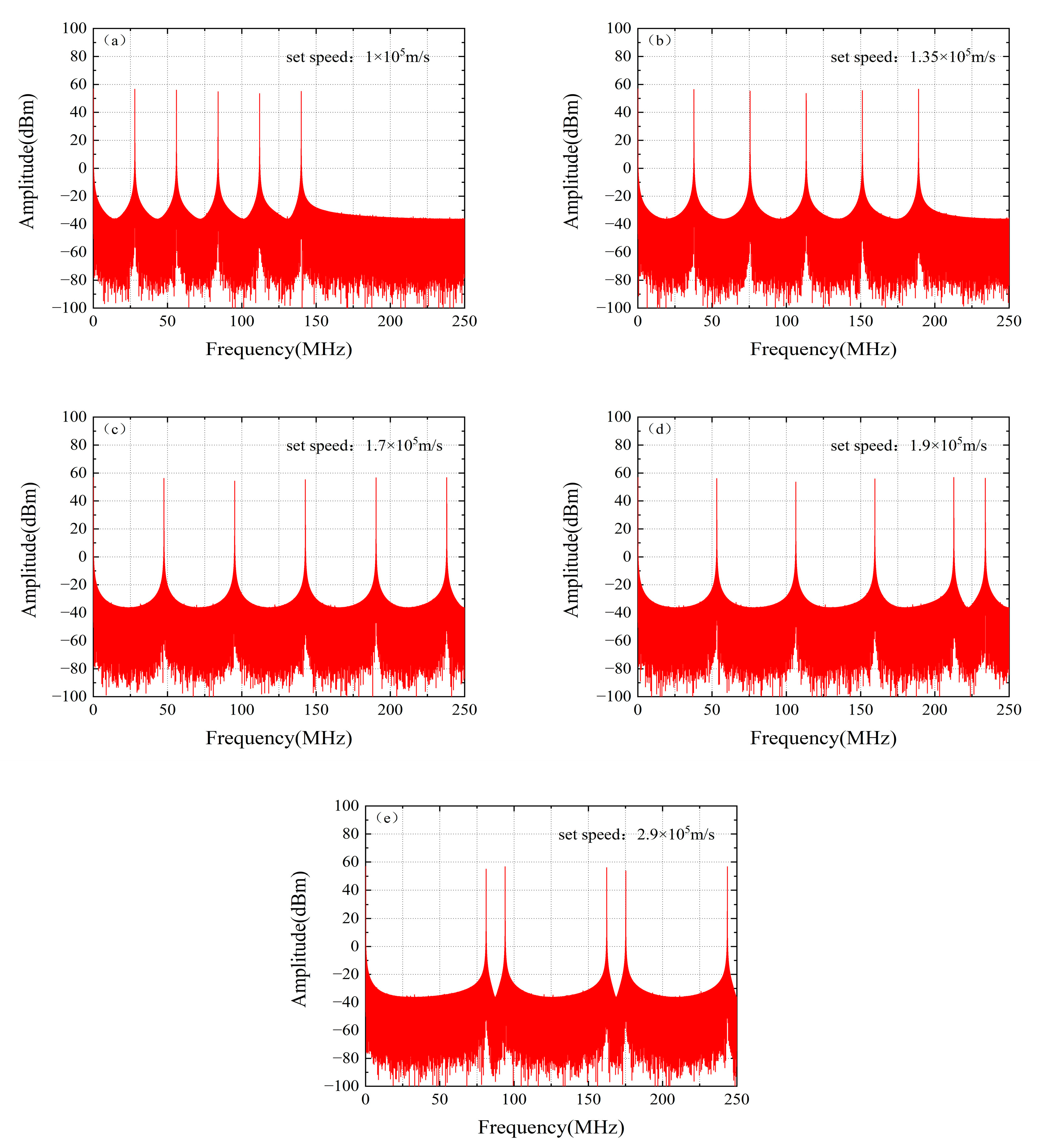 To validate the aforementioned theory, we conducted corresponding simulation analyses. In the simulations, the optical frequency comb was configured with a frequency spacing of 42 GHz, a carrier wavelength of 1550 nm, and uniform comb tooth amplitudes of 1. For five distinct target velocities—1 × 10