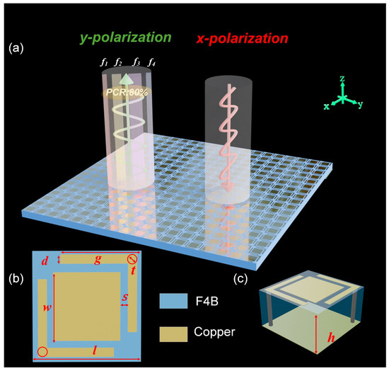 As shown in Figure 1, given the x-polarized incidence, the proposed metasurface exhibits four distinct perfect polarization conversion frequencies at –, while achieving polarization conversion ratio (PCR) exceeding 80% across the ultra-wideband range. The structure is composed of three layers arranged from top to bottom: a resonant layer, a dielectric spacer, and a reflective ground plane. Both the resonant and reflective layers are fabricated from copper, facilitating strong resonant interactions critical for efficient polarization conversion. The intermediate dielectric layer is constructed from F4B material ( and ), with a thickness of mm, optimized to maintain impedance matching and stable polarization conversion across the designated frequency band. The resonant patches incorporate grounded L-shaped hollow corners with through-hole copper pillars, where the inner diameter is defined as t = 0.5 mm. The detailed parameter design is listed in Table 1.