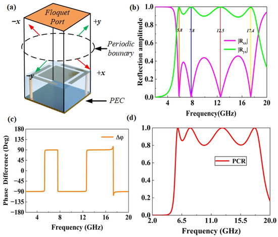 (a) Floquet mode analysis. (b) Reflection coefficients of co-polarization and cross-polarization, (c) Phase difference. (d) PCR.