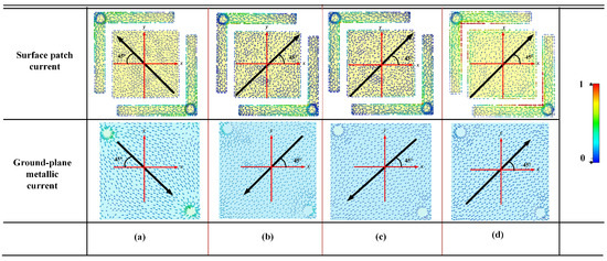 To explore the physical mechanism of the proposed polarization converter, we analyze the surface current distribution on the top electromagnetic structure of the unit at four frequencies. When the incident wave is x-polarized, an induced current in the x-direction is generated. However, due to the structural asymmetry, a portion of this current flows toward the y-direction, which induces an electric field along the y-direction. When the reflected electric field is orthogonal to the incident electric field and their magnitudes are equal, the angle between the direction of the total surface current induced on the patch and the x-axis is 45°, as indicated by the arrow in Figure 3.