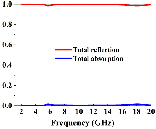 As shown in Figure 4, it is noted that the sum of and remains approximately equal to 1 across the entire operating frequency range, indicating that the absorption of the incident electromagnetic wave by the metasurface is extremely low. This observation confirms that almost all of the incident energy is reflected, either in the co-polarized or cross-polarized form, and only a negligible portion is dissipated as dielectric loss. Therefore, when calculating the PCR, the absorption term can be safely neglected without introducing significant error. The minimal absorption demonstrates that the metasurface operates under a nearly lossless condition, ensuring that the calculated PCR accurately represents the true polarization conversion efficiency of the device.