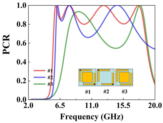 To systematically analyze the influence of each structural element, three representative unit cells are selected, as shown in Figure 5. The isolated rectangular patch is not simulated separately because it does not exhibit polarization conversion behavior on its own. Structure 1 includes only the grounded L-shaped corners, Structure 2 combines L-shaped corners with rectangular patches, and Structure 3 further incorporates through-hole copper vias. Comparing these three representative cases helps reveal the individual effects of the rectangular patch and the vias on the polarization conversion performance and bandwidth. As shown in Figure 5, by comparing the proposed metasurface structure with the version that lacks grounding via, we can conclude that incorporating through-hole copper pillars adds the number of resonant points by two and the polarization conversion efficiency is also improved. This is because the introduction of vias connects the upper and lower layers, providing an additional propagation path for electromagnetic energy, so that the electromagnetic energy can not only propagate in the plane but also couple between layers. This multi-path electromagnetic coupling will excite more different resonant modes, thus leading to an increase in the number of resonant points. In addition, by introducing vias to connect the upper and lower layers, a low-impedance transmission path can be constructed. This path can mitigate the impact of parasitic capacitance, enabling more efficient coupling and propagation of electromagnetic energy between layers, thereby improving the polarization conversion efficiency. In addition, when comparing the proposed metasurface structure with the grounded structure containing only L-shaped corners, it can be clearly found that the addition of rectangular patches within the L-shaped corners significantly enhances the polarization conversion effect. This improvement can be attributed to several coupled electromagnetic mechanisms. First, the rectangular patches extend the surface current paths and introduce additional capacitive coupling between adjacent metallic arms, which increases the local electric field intensity around the patch edges. The resulting enhancement in field confinement strengthens the cross-polarized reflection component. Second, the presence of rectangular patches modifies the equivalent LC network of the metasurface unit cell by introducing extra inductive and capacitive branches. These additional resonant pathways enable multiple LC modes to coexist and partially overlap, thereby broadening the effective bandwidth and improving conversion efficiency. Moreover, the compact geometry of the rectangular patches forms shorter current loops and higher current density, enhancing the magnetoelectric coupling and improving the polarization conversion performance without increasing the unit cell size. Collectively, these effects explain the observed enhancement in polarization conversion efficiency and bandwidth after incorporating the rectangular patches.