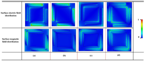 By analyzing the surface electric field distribution of the metasurface, it is observed that at 5.8 GHz and 7.8 GHz, the electric field is mainly concentrated on the L-shaped patches, which corresponds well with the results shown in Figure 6. This indicates that at lower frequencies, the diagonally arranged L-shaped patches and their via structures play a dominant role. At 12.5 GHz and 17.8 GHz, the electric field intensity on the rectangular patches gradually increases, which is consistent with the observation in Figure 6. This result demonstrates that the introduction of rectangular patch structures generates additional resonance modes in the higher frequency range, thereby effectively broadening the operating bandwidth. The magnetic field distribution exhibits a similar spatial pattern to that of the electric field, although the overall magnetic field intensity is comparatively weaker.