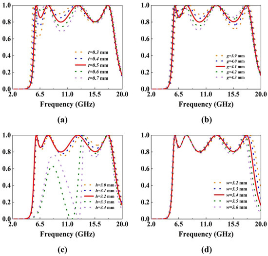 Figure 7a illustrates the relationship between the cylinder diameter t and the first and second troughs with relatively low conversion rates. As the diameter t increases, the conversion rate of the first trough increases significantly. This is because the cylinder determines the characteristics of the low-order modes at low frequencies. The increase in the diameter t improves the conversion effect of the first trough. However, if the radius is too large, it will affect the overall structure, resulting in a decrease in the conversion efficiency of the second trough. Figure 7b shows that as the arm length g of the L-shape increases, the second frequency point gradually shifts to lower frequencies. This is because a larger g extends the current-flowing length of the L-shaped patch, where the equivalent electrical length increases significantly, forcing the redistribution of the surface current. To adapt to the new state of the longer current path, the resonant frequency is adjusted to lower frequencies, showing a redshift. Figure 7c shows that the increase in h causes the third frequency point to shift to lower frequencies. This is because h extends the physical path of the electromagnetic wave propagation in the vertical direction, and the equivalent electrical length increases significantly. Thus, it changes the surface current distribution and the energy oscillation mode, and finally causes the resonant frequency to shift to lower frequencies. In addition, when h is too large exceeding 3.3 mm, the electromagnetic wave will suffer excessive loss during propagation, resulting in the inability to perform polarization conversion at lower frequencies. Figure 7d shows the relationship between the side length w of the central rectangular patch and the fourth polarization conversion frequency. As w increases, the fourth resonance point gradually shifts toward lower frequencies. This behavior can be attributed to the increased effective electrical length of the central patch, which lowers its resonant frequency. Since the central patch predominantly governs the higher-order mode behavior, its geometric expansion effectively modifies the surface current distribution, resulting in the observed redshift of the fourth polarization conversion band.