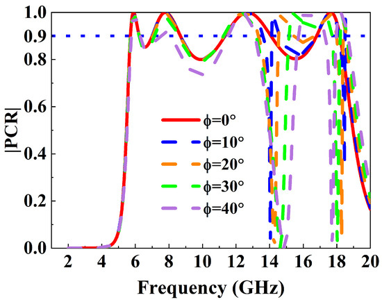 To evaluate the practical applicability of the proposed metasurface, we simulated its PCR under oblique incidence angles ranging from 0° to 40° in Figure 8. The results indicate that the metasurface exhibits excellent angular stability in the frequency ranges of 5.5 to 15 GHz and 16 to 17.5 GHz, while it is highly sensitive to the incident angle in the ranges of 13 to 15 GHz and 17.5 to 18.1 GHz. Specifically, the PCR decreases rapidly as the incident angle increases. Clearly, the designed metasurface shows good angular stability in the C-band and X-band. At higher frequencies within the Ku-band, the metasurface performance becomes more sensitive to the incident angle. This degradation mainly results from stronger impedance mismatch between the incident wave and the metasurface, as well as weaker coupling between adjacent unit cells. At larger oblique angles, higher-order resonant and surface modes are excited, which disturb the stable surface current distribution responsible for polarization conversion. In addition, as increases, the projection of the incident electric field on the metasurface plane becomes smaller, reducing the effective excitation of cross-polarized components. These combined effects lead to the reduced polarization conversion efficiency at large incidence angles. Clearly, for stable operation in the higher-frequency Ku-band, more precise control of the incident angle is required.